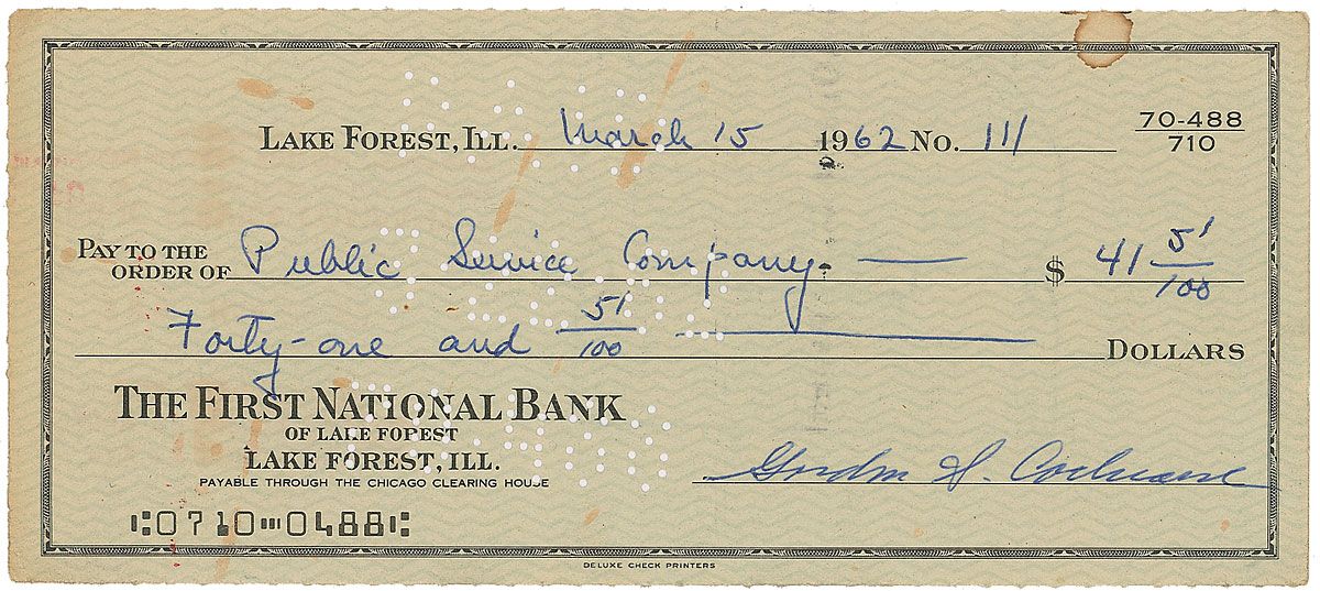 Bank check, 6.25 x 2.75, filled out in another hand and signed by Cochrane, “Gordon S. Cochrane,” payable to Public Service Company for $41.51, March 15, 1962. In very good condition, with bank stamps to body and scattered toning and spotting.