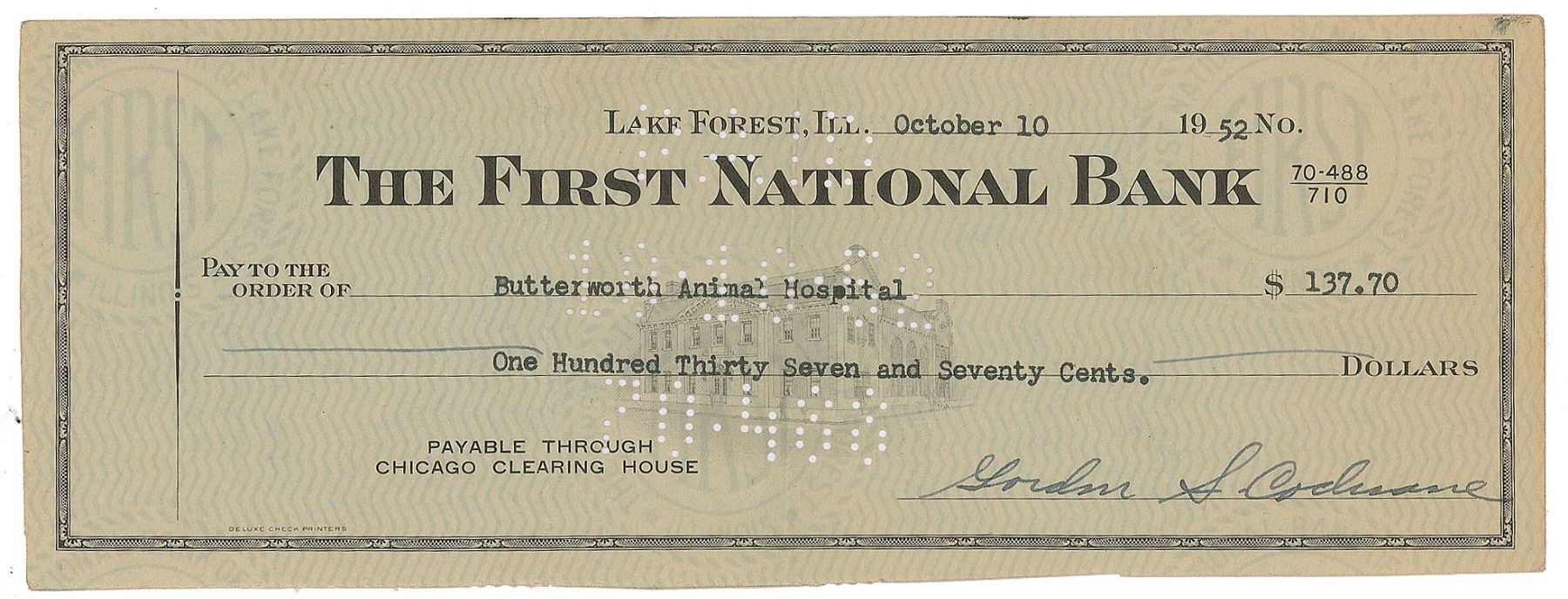The First National Bank check, 8.25 x 3, filled out in type and signed by Cochrane, "Gordon S. Cochrane," payable to Butterworth Animal Hospital for $137.70, October 10, 1952. In fine condition, with three vertical folds.