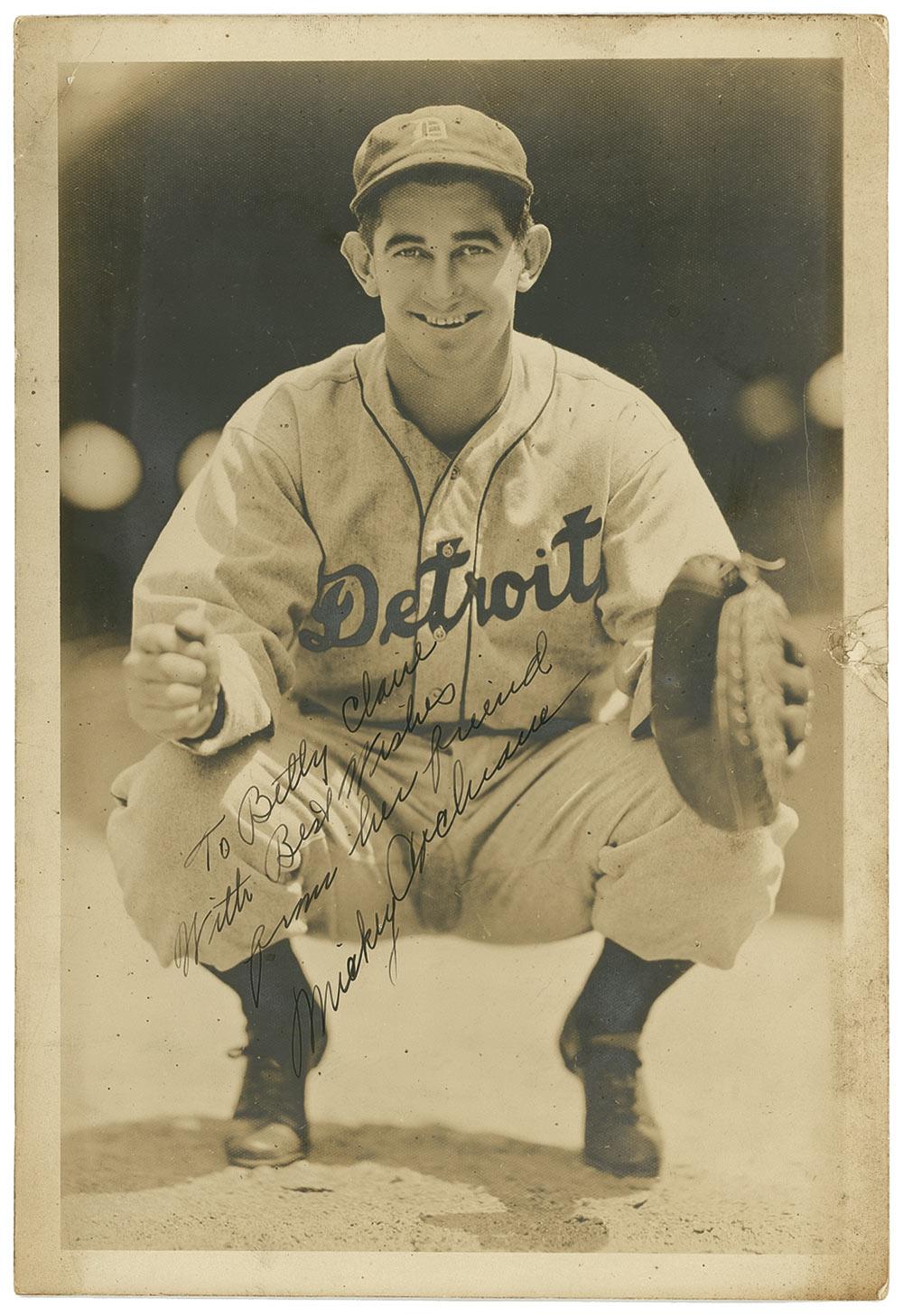 Baseball Hall of Famer (1903–1962) who batted .320 during his 13-year career. Vintage matte-finish 6.25 x 9.25 photo, signed and inscribed in black ink “To Betty Claire, with best wishes from her friend, Mickey Cochrane.” In very good condition, with scattered silvering, tear to right edge, and scattered creasing and soiling. Cochrane is quite uncommon in photos of this size. Pre-certified Steve Grad/PSA/DNA and RRAuction COA.