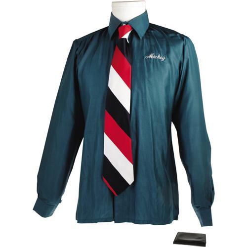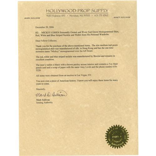 <B>Mickey Cohen Owned Shirt, Tie, and Wallet.</B></I> A dark green silk shirt with "Mickey" embroidered over the pocket, leather wallet, and red, white, and blue polyester tie, all from the personal belongings of alleged gangster Mickey Cohen. Items are in overall Very Fine to Excellent condition, with mild wear. <I>Accompanied by LOA from Hollywood Prop Supply.</B></I><BR><BR><b>Shipping:</b> Clothing, Costumes & Jerseys (<a target="_blank" href="http://www.heritageauctions.com/common/shipping.php">view shipping information</a>)