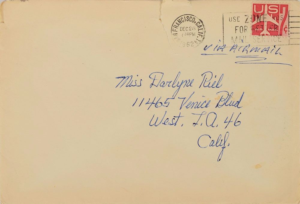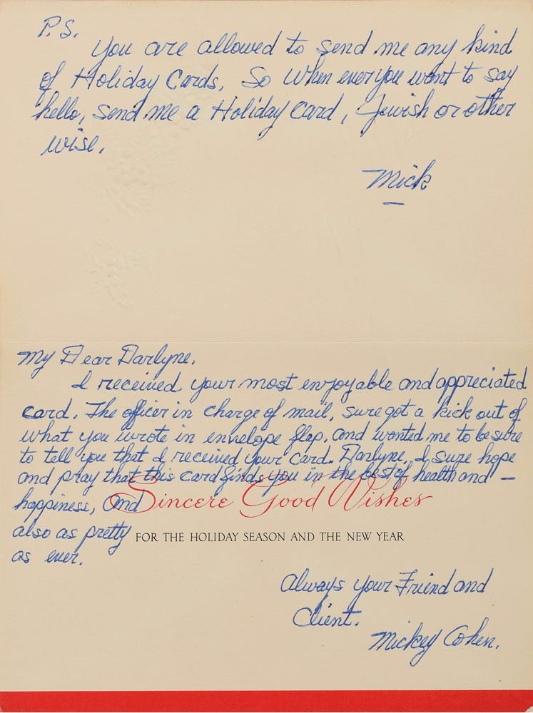 Gangster (1913–1976) born Meyer Cohen who was a trusted associate of racketeer Bugsy Siegel. After Siegel's death in 1947, Cohen acquired Siegel's West Coast gambling interests and lived extravagantly. After two convictions for income tax violations and 14 years in prison, Cohen pronounced himself a law-abiding citizen. ALS signed “Always your Friend and Client, Mickey Cohen" and "Mick," inside a 7.25 x 4.75 Season's Greetings card, [postmarked December 1962]. A letter written while imprisoned at Alcatraz, in full: "I received your most enjoyable and appreciated card. The officer in charge of mail, sure got a kick out of what you wrote in envelope flap, and wanted me to be sure to tell you that I received your card. Darlyne, I sure hope and pray that this card finds you in the best of health and—also as pretty as ever." He adds a postscript to the upper half, "P.S. You are allowed to send me any kind of Holiday cards. So when ever you want to say hello, send me a Holiday card, Jewish or other wise." In fine condition. Accompanied by the original mailing envelope addressed in Cohen's hand. The consignor notes that this was sent to his aunt, who worked as a manicurist in Los Angeles and was acquainted with many celebrities.
