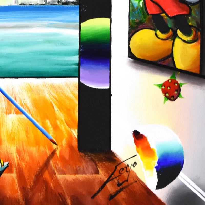 "Mickey & Donald Play" is an original oil painting on stretched canvas by Ferjo, hand signed by the artist. Includes Letter of Authenticity. Measures approx. 20" x 24" (image).