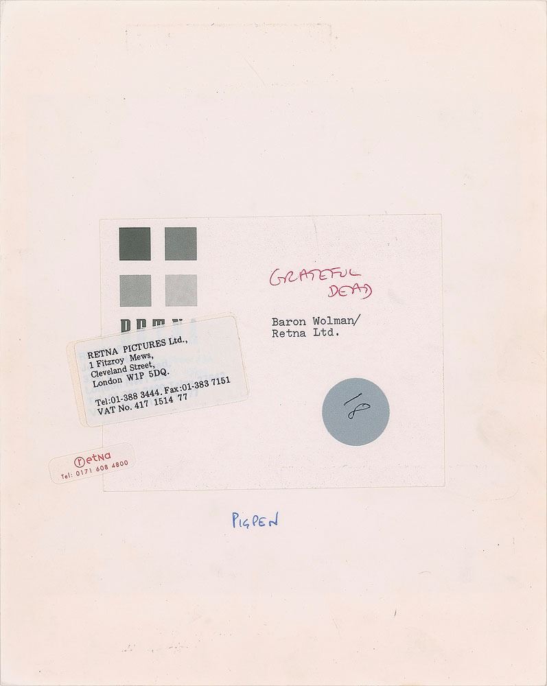 Original glossy 8 x 10 silver gelatin photo of Grateful Dead drummer Mickey Hart in a lighthearted three-quarter-length pose. Reverse bears three affixed RETNA Pictures labels, one of which credits photographer Baron Wolman; reverse is also erroneously identified as Ron ‘Pigpen’ McKernan. In fine condition, with tape remnant to lower border. Wolman is a famed rock photographer best known for his work with Rolling Stone during the magazine's nascent years. From the Globe Photo archives.