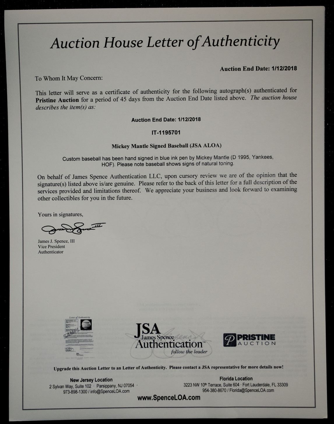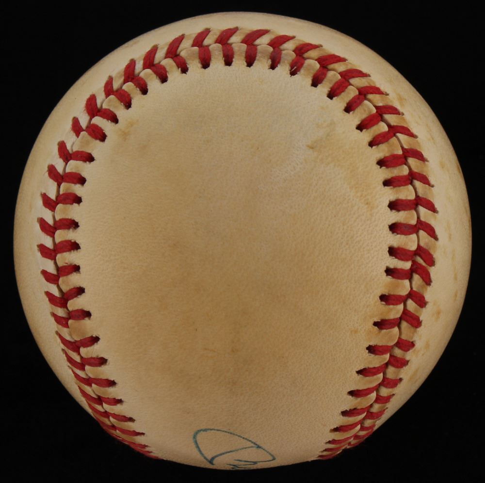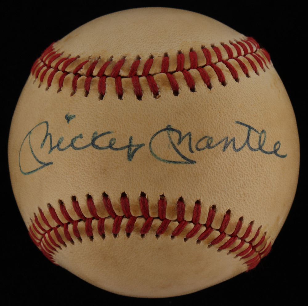 Baseball has beautiful natual toning and been hand signed in blue ink pen by Mickey Mantle himself (ID 1995, Yankees, HOF).