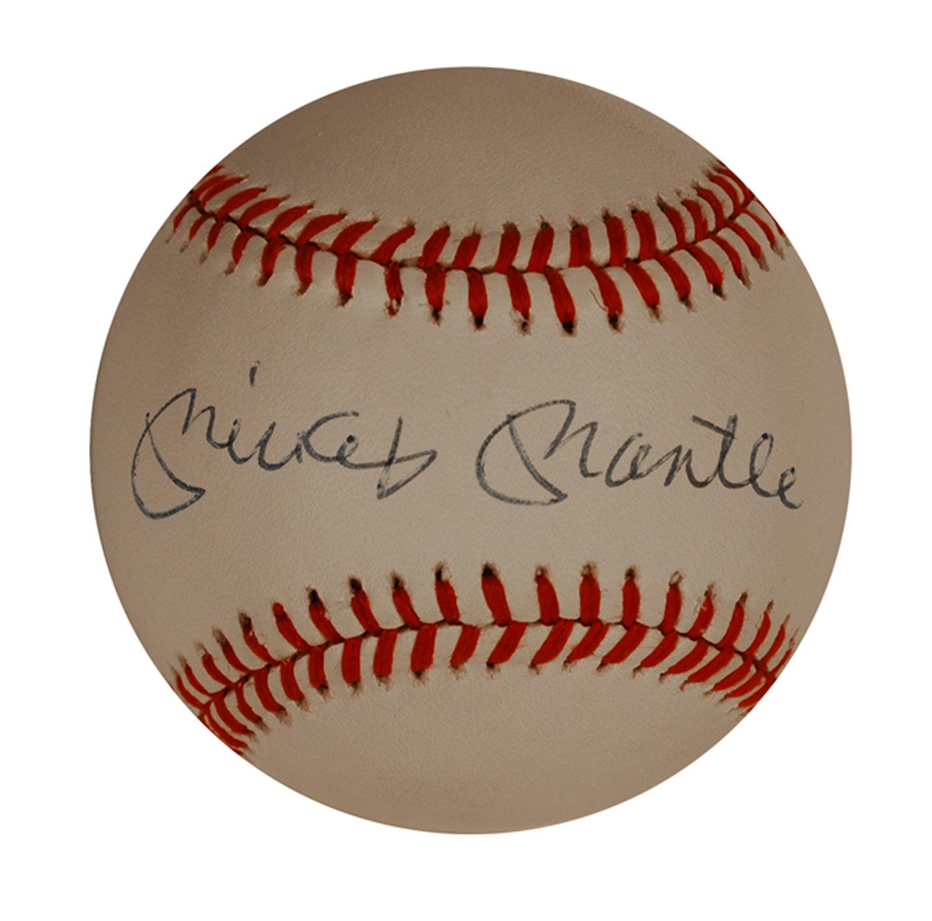 Mickey Mantle official American League Rawlings ball signed on the sweet spot in blue ballpoint pen. Printed signature of Bobby Brown, American League President. With PSA/DNA COA. Fine condition.