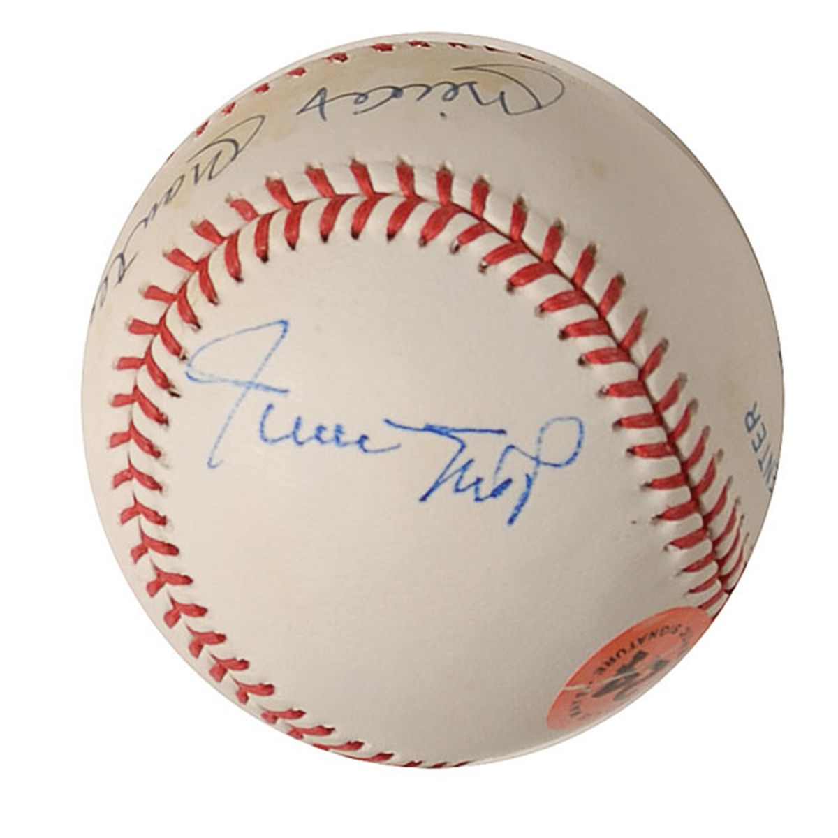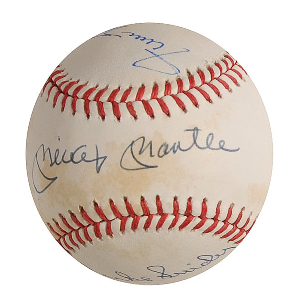 Official Rawlings National League baseball signed in blue ballpoint on the sweet spot by Mickey Mantle and on the side panels in blue ballpoint by Duke Snider and in blue felt tip by Willie Mays. In very good condition, with scattered toning affecting Mantle’s signature.