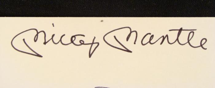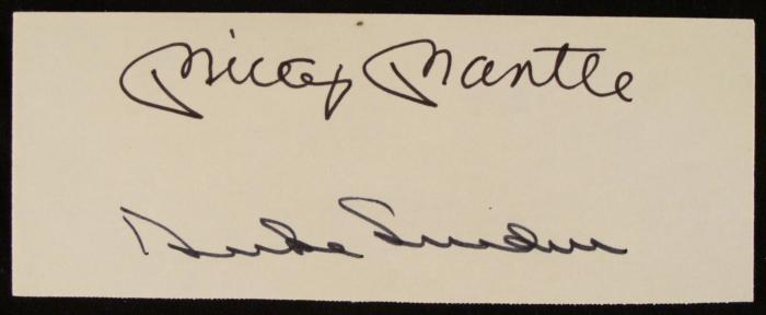 This piece of paper was signed by both Mickey Mantle and Duke Snyder. The two New York baseball legends signed their names in black marker on a 2" x 5" sheet of paper. It is in excellent condition.