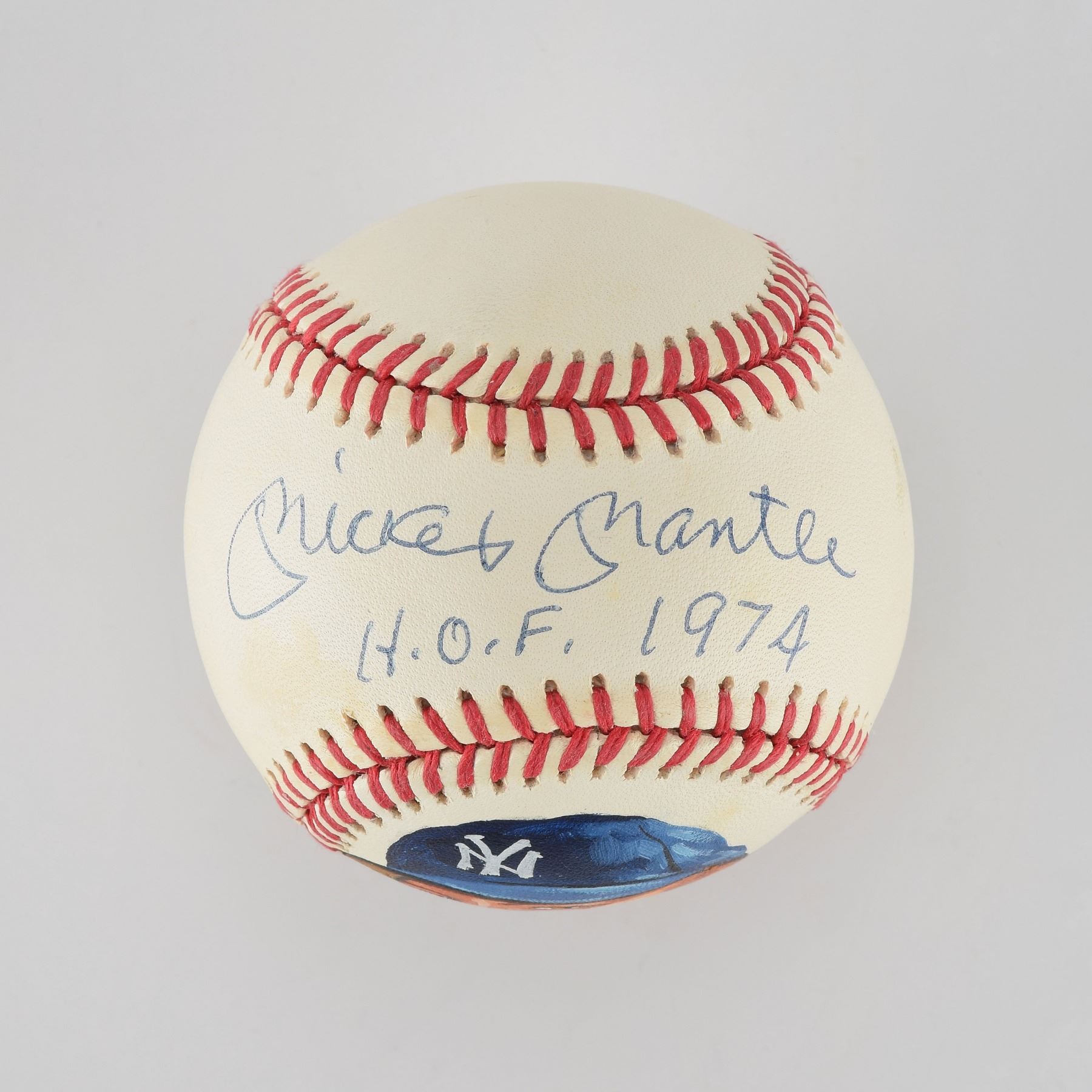 Perfectly placed blue ink "Mickey Mantle H.O.F. 1974" specialty inscribed signature on a hand-painted Mantle portrait OAL Brown baseball.