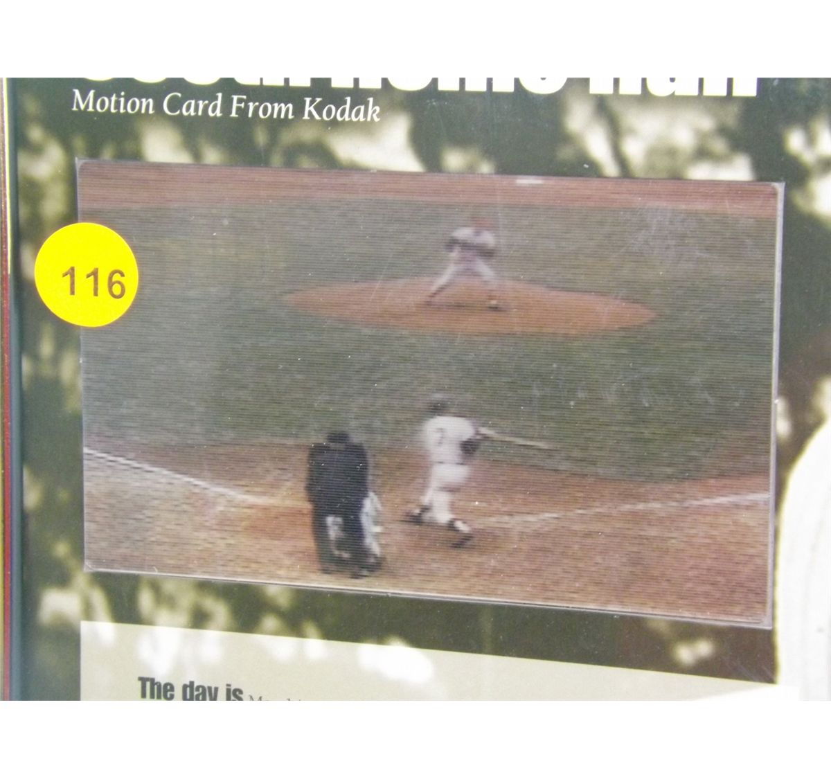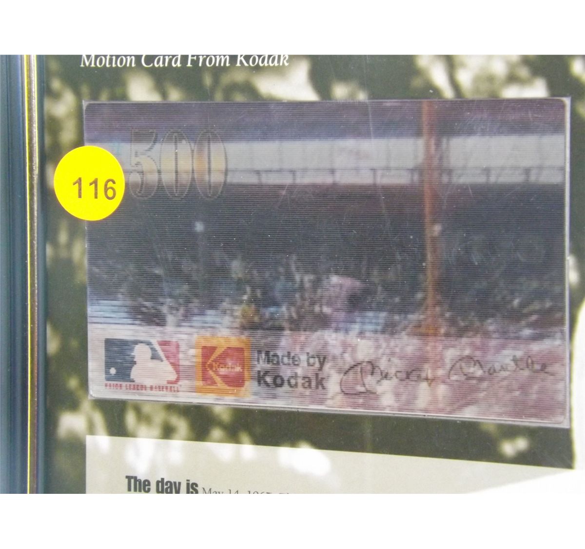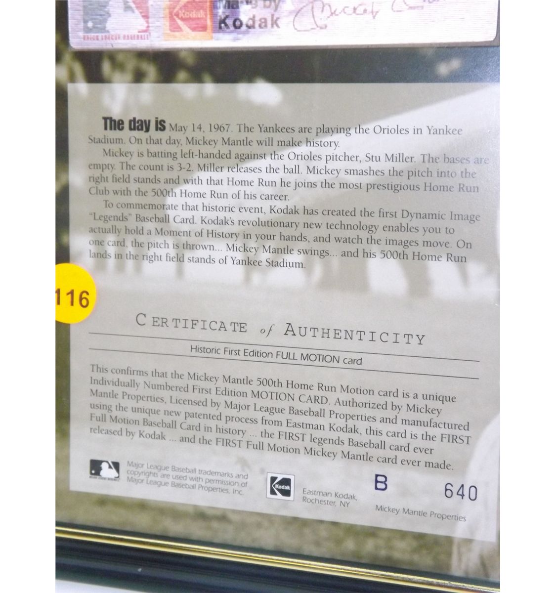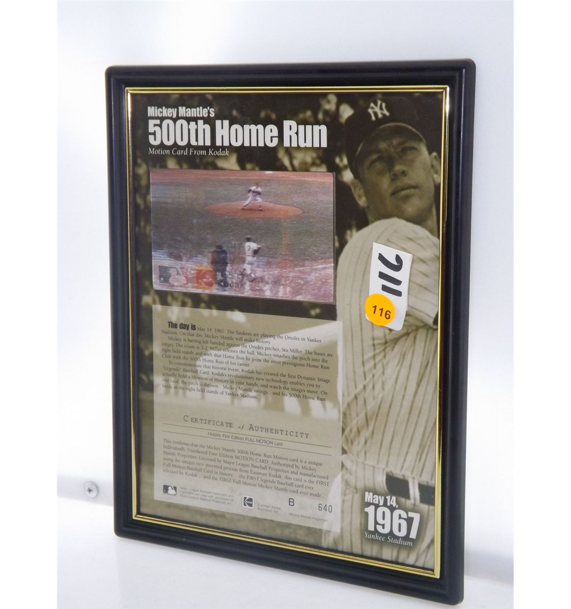 Mickey Mantle Motion Card. Framed Kodak Motion Card under Glass. Appraised or estimated retail value $250. COA by Kodak. All Sales Final. Please see terms and conditions of auction.