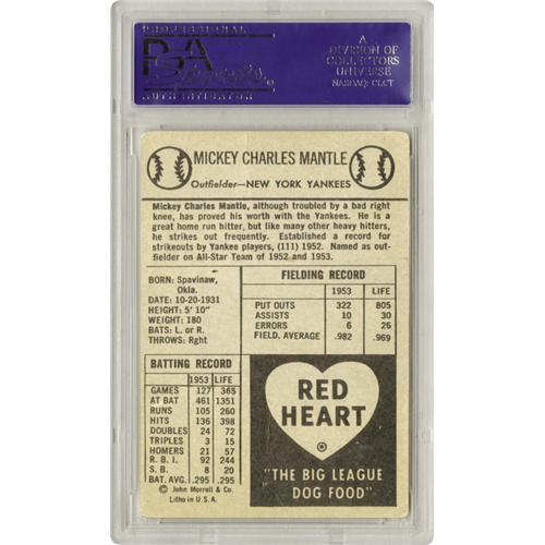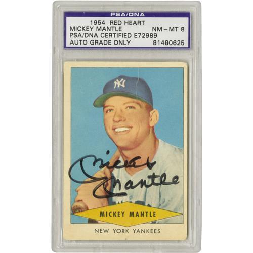 <B>Mickey Mantle Signed 1954 Red Heart, Autograph Grade PSA NM-MT 8.</B></I> A booming black sharpie signature from the young man pictured on the face of this tough card makes this a particularly hot commodity in the scorching Mickey Mantle market. The card itself grades a technical VG due to corner rounding and a vertical wrinkle that is not particularly noticeable. For every hundred signed baseballs, you'll find maybe one signed vintage card. This should ensure that the piece will hold its value well. <BR><BR><B>Important notice:</B> Heritage usually auctions material at the rate of 200-250 lots per hour. On some occasions eBay Live bid software or the Internet may not be able to keep up with the pace of the auction. We recommend placing a realistic absentee bid now as insurance to avoid disappointment. Occasionally the auctioneer may eliminate or reject an eBay Live bid, and the auctioneer may also reopen a lot after the close of the eBay live bidding (usually because we missed an audience bid), and may reject your bid even if it shows you as the winning bidder. By bidding via eBay Live, you agree that Heritage may award the lot to another bidder at its sole discretion under the circumstances described above or any other reasonable circumstances. Since eBay bids are not shown to us until we open the lot on the floor, we treat those bids just like floor bids. In most cases the floor responds before the eBay bid is presented to us, due to Internet lag time, so for consistency we have made it a policy that floor bids are always considered first over tie eBay live bids. Also please note that all Heritage lots purchased through eBay Live carry a 22.5% Buyer's Premium. Please make sure you read the Terms and Conditions before you bid. This lot is being auctioned in conjunction with a live floor auction by Heritage Galleries & Auctioneers. All final auction and invoice information will be supplied by Heritage Galleries & Auctioneers, and all other information should be considered preliminary. Lot:19093 <BR><BR><B>Winning Notification and Billing:</B> After the FINAL session in this auction is complete, Heritage will send e-mail and snail mail invoices. This process normally takes several days. All final auction and invoice information will be supplied by Heritage Galleries & Auctioneers, and all other information should be considered preliminary. <BR><BR>This auction will be conducted on a live auction floor and over the Internet through eBay Live. If you choose to place an absentee bid, please take a moment to <font color='#0000ff'><u><a href='http://pages.ebay.com/liveauctions/help/before/laabsentee.html'>learn how eBay Live absentee bidding works</a></u></font><font color='#000000'>
