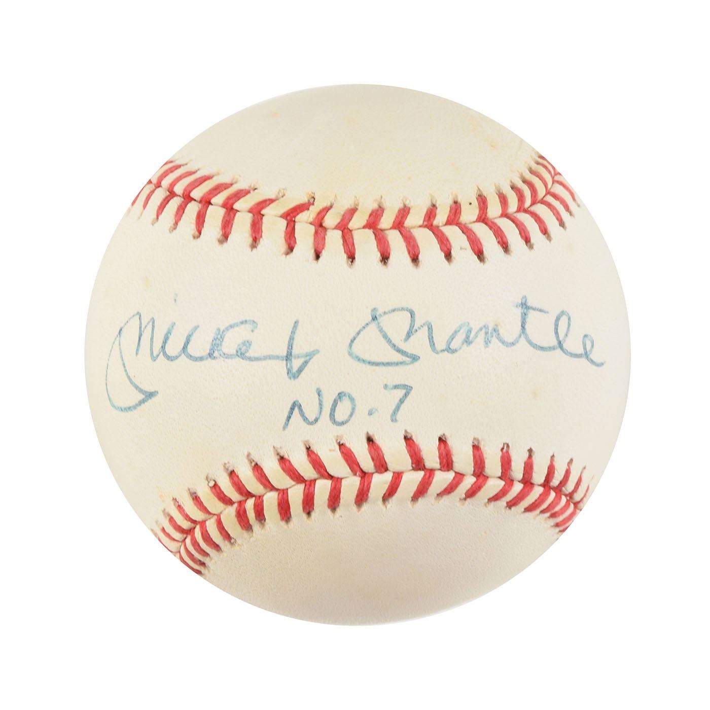 Official Rawlings American League (Brown) baseball signed on the sweet spot in blue ballpoint, "Mickey Mantle, No.7." In fine condition. Accompanied by a full letter of authenticity from JSA.