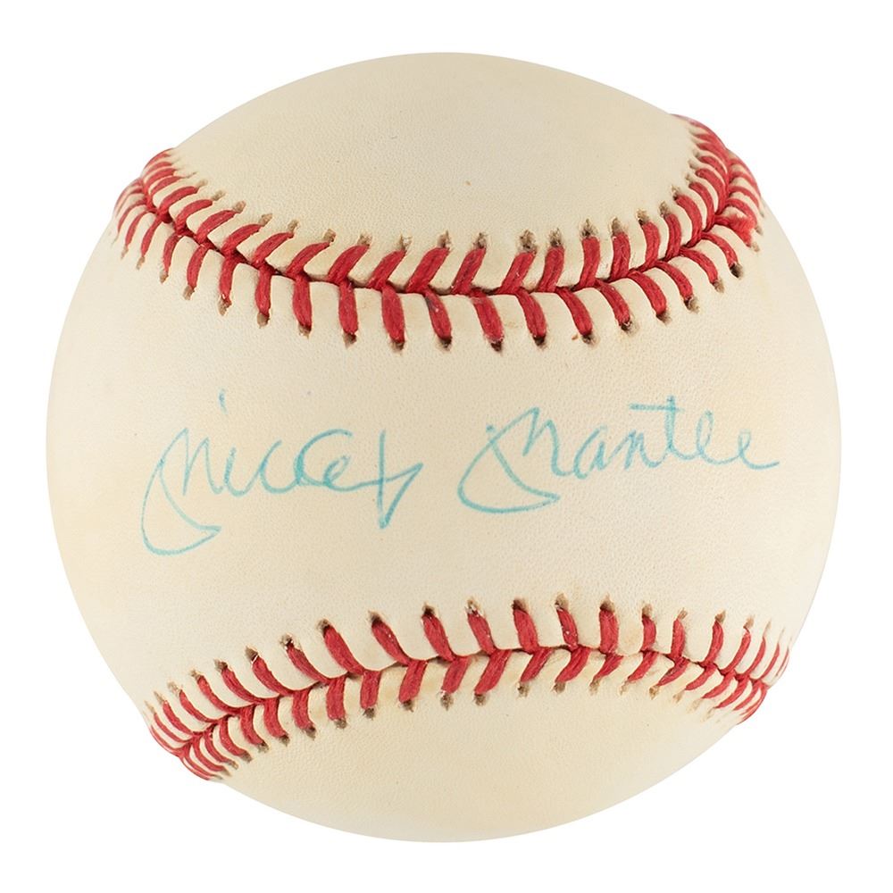 Official Rawlings American League (Brown) baseball signed in blue ballpoint on the sweet spot, "Mickey Mantle." In fine condition, with very light toning to side panels.