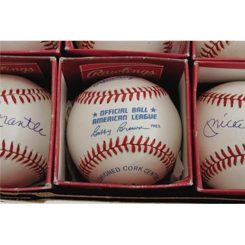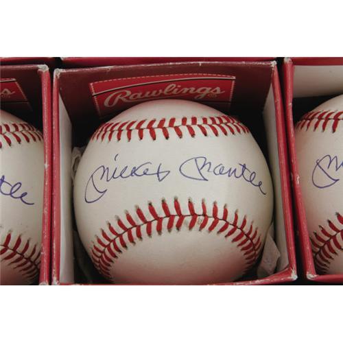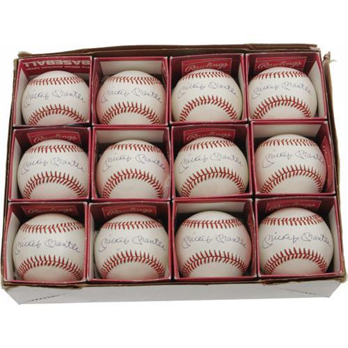 <B>Mickey Mantle Single Signed Baseballs Lot of 12.</B></I> Dealers and collectors alike would be well advised to take notice of this opportunity, one of the most sure-fire investments in the auction. The value of Mantle singles continues to rise, and these OAL (Brown) balls remain in terrific condition, with only the occasional very mild shading to dismiss a Mint grade, which the autographs themselves surely merit. The surge in value of Mantle balls has made bulk offerings like this one quite rare--who knows when you'll see another one? <I>LOA from PSA/DNA.</B></I> <BR><BR><B>Important notice:</B> Heritage usually auctions material at the rate of 200-250 lots per hour. On some occasions eBay Live bid software or the Internet may not be able to keep up with the pace of the auction. We recommend placing a realistic absentee bid now as insurance to avoid disappointment. Occasionally the auctioneer may eliminate or reject an eBay Live bid, and the auctioneer may also reopen a lot after the close of the eBay live bidding (usually because we missed an audience bid), and may reject your bid even if it shows you as the winning bidder. By bidding via eBay Live, you agree that Heritage may award the lot to another bidder at its sole discretion under the circumstances described above or any other reasonable circumstances. Since eBay bids are not shown to us until we open the lot on the floor, we treat those bids just like floor bids. In most cases the floor responds before the eBay bid is presented to us, due to Internet lag time, so for consistency we have made it a policy that floor bids are always considered first over tie eBay live bids. Also please note that all Heritage lots purchased through eBay Live carry a 22.5% Buyer's Premium. Please make sure you read the Terms and Conditions before you bid. This lot is being auctioned in conjunction with a live floor auction by Heritage Galleries & Auctioneers. All final auction and invoice information will be supplied by Heritage Galleries & Auctioneers, and all other information should be considered preliminary. Lot:19034 <BR><BR><B>Winning Notification and Billing:</B> After the FINAL session in this auction is complete, Heritage will send e-mail and snail mail invoices. This process normally takes several days. All final auction and invoice information will be supplied by Heritage Galleries & Auctioneers, and all other information should be considered preliminary. <BR><BR>This auction will be conducted on a live auction floor and over the Internet through eBay Live. If you choose to place an absentee bid, please take a moment to <font color='#0000ff'><u><a href='http://pages.ebay.com/liveauctions/help/before/laabsentee.html'>learn how eBay Live absentee bidding works</a></u></font><font color='#000000'>