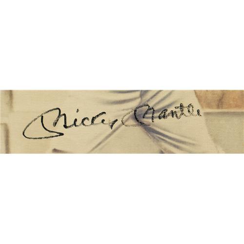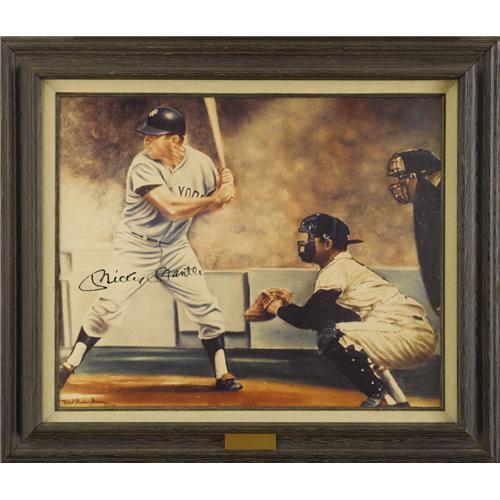 <B>Mickey Mantle Signed Giclee.</B></I> Early print on canvas by famed sports artist Robert Stephen Simon is reminiscent of Norman Rockwell's work, and captures the powerful Mick in a left-handed stance in his road grays. A black sharpie signature from the subject rates 9/10, and measures a full seven inches in length. Canvas size is 18x22.5", with framing bringing the final dimensions to 25x29". A terrific display piece honoring everybody's favorite Yankee. <I>LOA from PSA/DNA.</B></I> <BR><BR><B>Important notice:</B> Heritage usually auctions material at the rate of 200-250 lots per hour. On some occasions eBay Live bid software or the Internet may not be able to keep up with the pace of the auction. We recommend placing a realistic absentee bid now as insurance to avoid disappointment. Occasionally the auctioneer may eliminate or reject an eBay Live bid, and the auctioneer may also reopen a lot after the close of the eBay live bidding (usually because we missed an audience bid), and may reject your bid even if it shows you as the winning bidder. By bidding via eBay Live, you agree that Heritage may award the lot to another bidder at its sole discretion under the circumstances described above or any other reasonable circumstances. Since eBay bids are not shown to us until we open the lot on the floor, we treat those bids just like floor bids. In most cases the floor responds before the eBay bid is presented to us, due to Internet lag time, so for consistency we have made it a policy that floor bids are always considered first over tie eBay live bids. Also please note that all Heritage lots purchased through eBay Live carry a 22.5% Buyer's Premium. Please make sure you read the Terms and Conditions before you bid. This lot is being auctioned in conjunction with a live floor auction by Heritage Galleries & Auctioneers. All final auction and invoice information will be supplied by Heritage Galleries & Auctioneers, and all other information should be considered preliminary. Lot:19115 <BR><BR><B>Winning Notification and Billing:</B> After the FINAL session in this auction is complete, Heritage will send e-mail and snail mail invoices. This process normally takes several days. All final auction and invoice information will be supplied by Heritage Galleries & Auctioneers, and all other information should be considered preliminary. <BR><BR>This auction will be conducted on a live auction floor and over the Internet through eBay Live. If you choose to place an absentee bid, please take a moment to <font color='#0000ff'><u><a href='http://pages.ebay.com/liveauctions/help/before/laabsentee.html'>learn how eBay Live absentee bidding works</a></u></font><font color='#000000'>