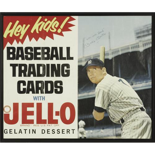 <B>Mickey Mantle Signed 1962-63 Jello Advertising Poster.</B></I> Tremendously rare and desirable in its unsigned state (one of the few known specimens sold at auction in 2004 for over $6,000), the example we offer here triples the appeal with a flawless blue sharpie signature from the pinstriped legend pictured, who adds the charming Jello slogan inscription "um um Good." This singularly unique piece derives, rather unsurprisingly, from the vast personal collection of Barry Halper, and demonstrates original folding creases and a scattering of insignificant smaller creases. None of these issues manages to come close to derailing the monumental visual appeal created by the oversized photographic portrait of the Mick and the bold text of a piece that conspire to an impressive 30x35" in size. <I>LOA from PSA/DNA.</B></I> <BR><BR><B>Important notice:</B> Heritage usually auctions material at the rate of 200-250 lots per hour. On some occasions eBay Live bid software or the Internet may not be able to keep up with the pace of the auction. We recommend placing a realistic absentee bid now as insurance to avoid disappointment. Occasionally the auctioneer may eliminate or reject an eBay Live bid, and the auctioneer may also reopen a lot after the close of the eBay live bidding (usually because we missed an audience bid), and may reject your bid even if it shows you as the winning bidder. By bidding via eBay Live, you agree that Heritage may award the lot to another bidder at its sole discretion under the circumstances described above or any other reasonable circumstances. Since eBay bids are not shown to us until we open the lot on the floor, we treat those bids just like floor bids. In most cases the floor responds before the eBay bid is presented to us, due to Internet lag time, so for consistency we have made it a policy that floor bids are always considered first over tie eBay live bids. Also please note that all Heritage lots purchased through eBay Live carry a 22.5% Buyer's Premium. Please make sure you read the Terms and Conditions before you bid. This lot is being auctioned in conjunction with a live floor auction by Heritage Galleries & Auctioneers. All final auction and invoice information will be supplied by Heritage Galleries & Auctioneers, and all other information should be considered preliminary. Lot:19103 <BR><BR><B>Winning Notification and Billing:</B> After the FINAL session in this auction is complete, Heritage will send e-mail and snail mail invoices. This process normally takes several days. All final auction and invoice information will be supplied by Heritage Galleries & Auctioneers, and all other information should be considered preliminary. <BR><BR>This auction will be conducted on a live auction floor and over the Internet through eBay Live. If you choose to place an absentee bid, please take a moment to <font color='#0000ff'><u><a href='http://pages.ebay.com/liveauctions/help/before/laabsentee.html'>learn how eBay Live absentee bidding works</a></u></font><font color='#000000'>