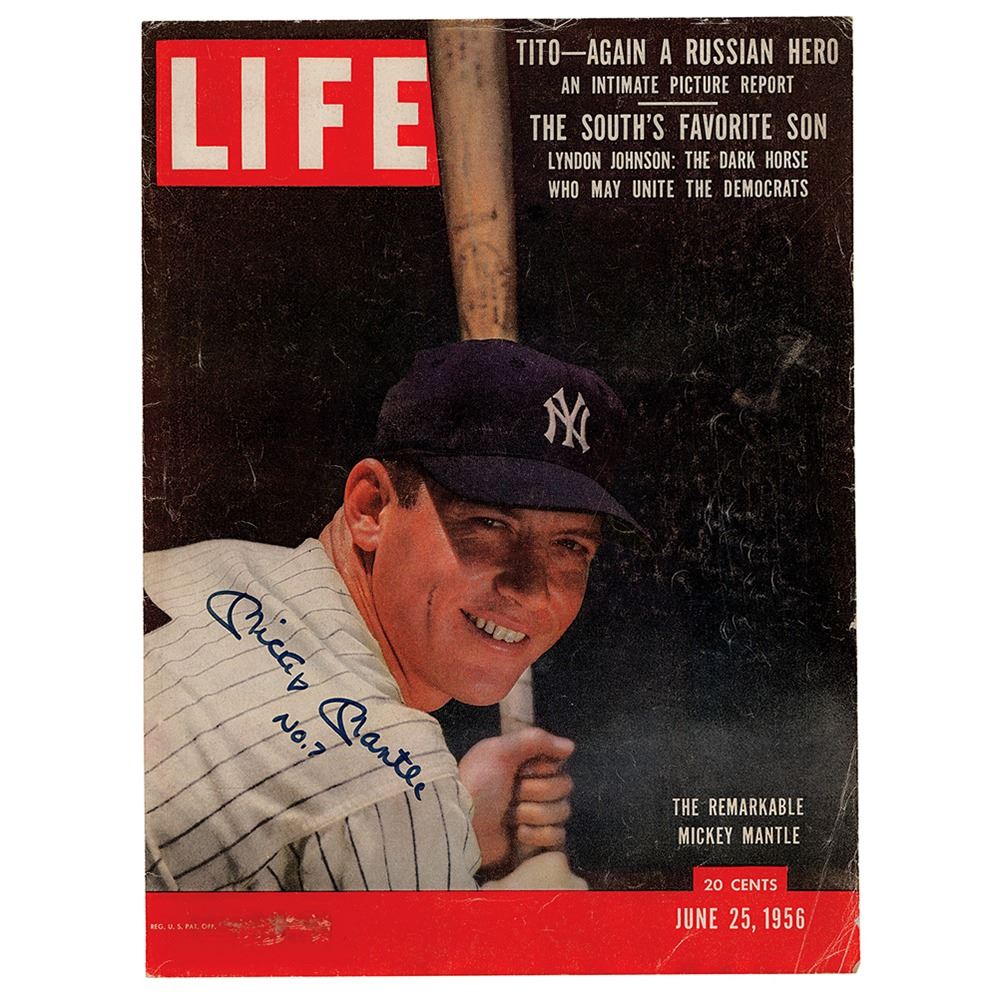 Front cover removed from the June 25, 1956 issue of Life Magazine, 10.25 x 14, signed in black felt tip, "Mickey Mantle, No. 7.". In very good to fine condition, with light scuffing and creasing, and a removed mailing label to the lower left corner. Mantle would go on to win the Triple Crown in 1956, batting .353 with 52 home runs and 130 RBI.