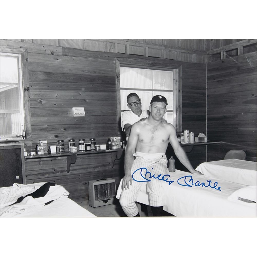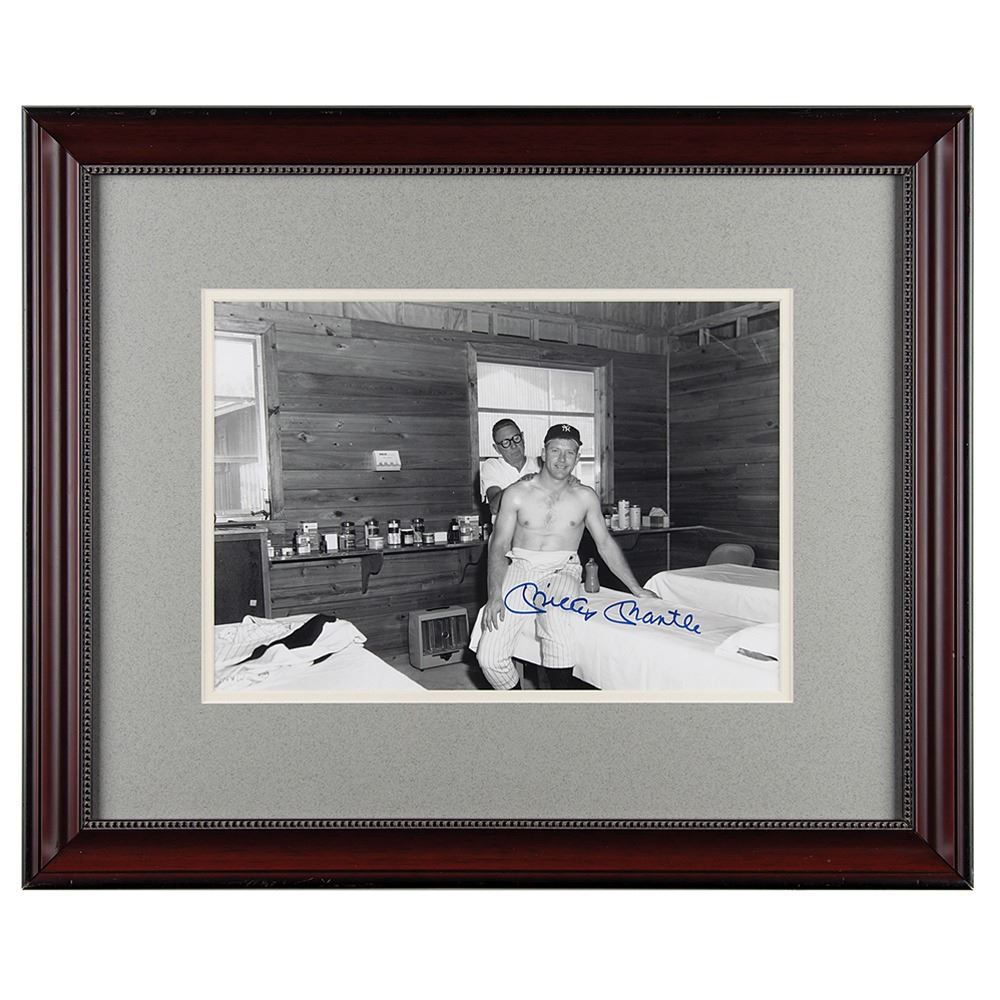 Uncommon glossy 13.75 x 9.5 photo of a bare-chested Mickey Mantle seated and smiling in his New York Yankees uniform as he receives a back rub in the trainer's room, signed in blue felt tip. Double-matted and framed to an overall size of 23 x 19. In fine condition. A rarely seen pose signed by the Hall of Famer.