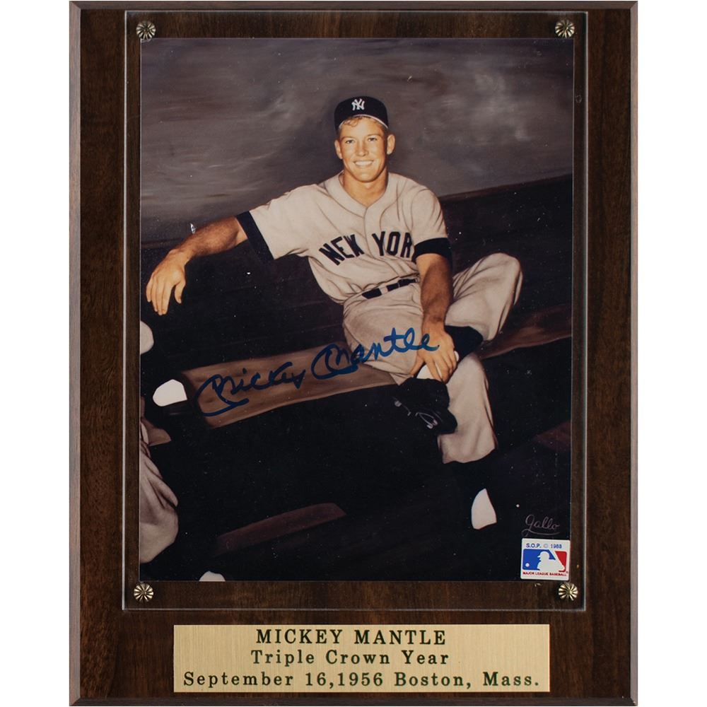 Color glossy 8 x 10 photo of an artistic depiction of Mickey Mantle seated in the Yankees dugout, signed in blue felt tip. Displayed under Plexiglas on a wooden 10.5 x 13 mount with an affixed plaque. In fine condition.
