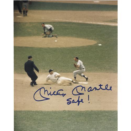 <B>Mickey Mantle Signed Photographs Lot of 2.</B></I> Here are two images we don't believe we've seen before, and one inscription we know we haven't. Action shots capture the Mick at Yankee Stadium, about to uncork a home run swing and swiping second base successfully. The latter photo offers an umpiring call from the Yankee legend, as he adds the word "Safe!" to his perfect blue sharpie signature. Each photo is in NRMT-MT condition, and measures 8x10" in size. <I>LOA from PSA/DNA.</B></I> <BR><BR><B>Important notice:</B> Heritage usually auctions material at the rate of 200-250 lots per hour. On some occasions eBay Live bid software or the Internet may not be able to keep up with the pace of the auction. We recommend placing a realistic absentee bid now as insurance to avoid disappointment. Occasionally the auctioneer may eliminate or reject an eBay Live bid, and the auctioneer may also reopen a lot after the close of the eBay live bidding (usually because we missed an audience bid), and may reject your bid even if it shows you as the winning bidder. By bidding via eBay Live, you agree that Heritage may award the lot to another bidder at its sole discretion under the circumstances described above or any other reasonable circumstances. Since eBay bids are not shown to us until we open the lot on the floor, we treat those bids just like floor bids. In most cases the floor responds before the eBay bid is presented to us, due to Internet lag time, so for consistency we have made it a policy that floor bids are always considered first over tie eBay live bids. Also please note that all Heritage lots purchased through eBay Live carry a 22.5% Buyer's Premium. Please make sure you read the Terms and Conditions before you bid. This lot is being auctioned in conjunction with a live floor auction by Heritage Galleries & Auctioneers. All final auction and invoice information will be supplied by Heritage Galleries & Auctioneers, and all other information should be considered preliminary. Lot:19114 <BR><BR><B>Winning Notification and Billing:</B> After the FINAL session in this auction is complete, Heritage will send e-mail and snail mail invoices. This process normally takes several days. All final auction and invoice information will be supplied by Heritage Galleries & Auctioneers, and all other information should be considered preliminary. <BR><BR>This auction will be conducted on a live auction floor and over the Internet through eBay Live. If you choose to place an absentee bid, please take a moment to <font color='#0000ff'><u><a href='http://pages.ebay.com/liveauctions/help/before/laabsentee.html'>learn how eBay Live absentee bidding works</a></u></font><font color='#000000'>