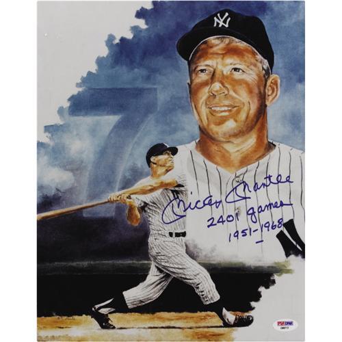 <B>Mickey Mantle Signed Advertising Sign & Large Photograph.</B></I> A pair of 10/10 blue sharpie signatures from the Yankee great offers a little something extra for his legions of avid collectors. Budweiser advertising sign picturing the M&M boys is inscribed "Our Best Wishes, Mickey Mantle." Viewable image is 10.5x14", and piece is matted and framed to 18x21". Also here is an 11x14" photographic print of a fine portrait painting which bears the unbelievable inscription, "Mickey Mantle, 2401 games, 1951-1968." Both pieces present in NRMT-MT condition. <I>LOA from PSA/DNA.</B></I> <BR><BR><B>Important notice:</B> Heritage usually auctions material at the rate of 200-250 lots per hour. On some occasions eBay Live bid software or the Internet may not be able to keep up with the pace of the auction. We recommend placing a realistic absentee bid now as insurance to avoid disappointment. Occasionally the auctioneer may eliminate or reject an eBay Live bid, and the auctioneer may also reopen a lot after the close of the eBay live bidding (usually because we missed an audience bid), and may reject your bid even if it shows you as the winning bidder. By bidding via eBay Live, you agree that Heritage may award the lot to another bidder at its sole discretion under the circumstances described above or any other reasonable circumstances. Since eBay bids are not shown to us until we open the lot on the floor, we treat those bids just like floor bids. In most cases the floor responds before the eBay bid is presented to us, due to Internet lag time, so for consistency we have made it a policy that floor bids are always considered first over tie eBay live bids. Also please note that all Heritage lots purchased through eBay Live carry a 22.5% Buyer's Premium. Please make sure you read the Terms and Conditions before you bid. This lot is being auctioned in conjunction with a live floor auction by Heritage Galleries & Auctioneers. All final auction and invoice information will be supplied by Heritage Galleries & Auctioneers, and all other information should be considered preliminary. Lot:19116 <BR><BR><B>Winning Notification and Billing:</B> After the FINAL session in this auction is complete, Heritage will send e-mail and snail mail invoices. This process normally takes several days. All final auction and invoice information will be supplied by Heritage Galleries & Auctioneers, and all other information should be considered preliminary. <BR><BR>This auction will be conducted on a live auction floor and over the Internet through eBay Live. If you choose to place an absentee bid, please take a moment to <font color='#0000ff'><u><a href='http://pages.ebay.com/liveauctions/help/before/laabsentee.html'>learn how eBay Live absentee bidding works</a></u></font><font color='#000000'>