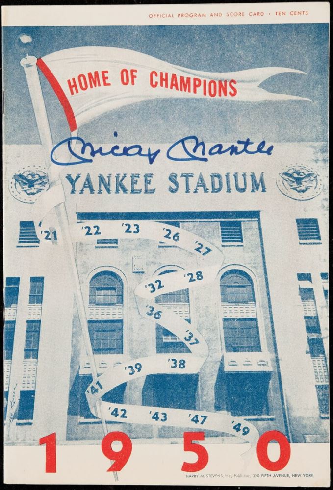 Original scored 1950 Yankees scorecard hand-signed on the cover in blue felt tip pen by Mickey Mantle (D 1995, HOF). The scorecard is in nice condition with some expected light wear.