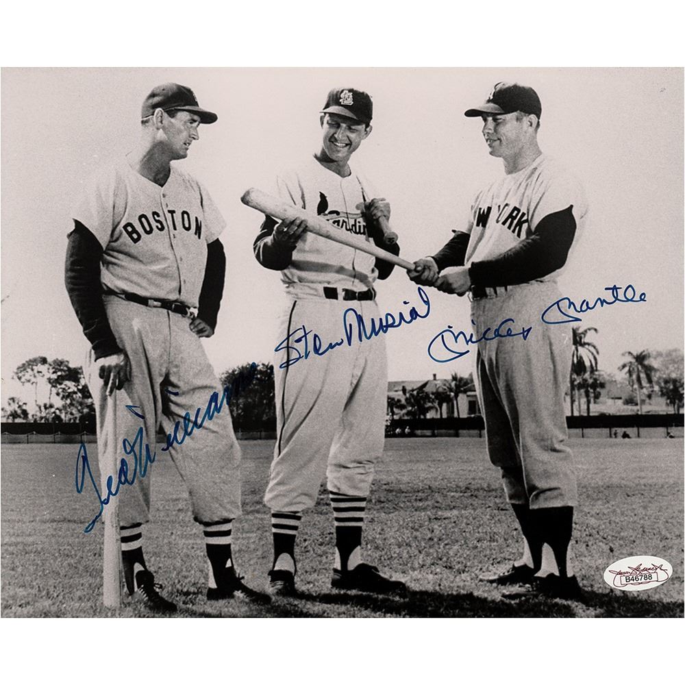 Glossy 9.75 x 8 photo of the three Hall of Fame outfielders, signed in blue felt tip by Mickey Mantle, Ted Williams, and Stan Musial. In fine condition, with a JSA label affixed to the lower right corner. Accompanied by a full letter of authenticity from JSA.