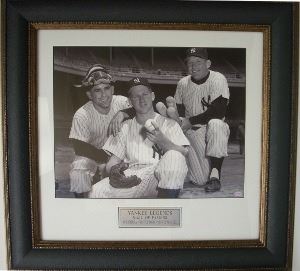 Classic Black and White Photo with Mickey Mantle, Yogi Berra and Whitey Ford. Premium Leather framed and matted unsigned 11X14 photo.