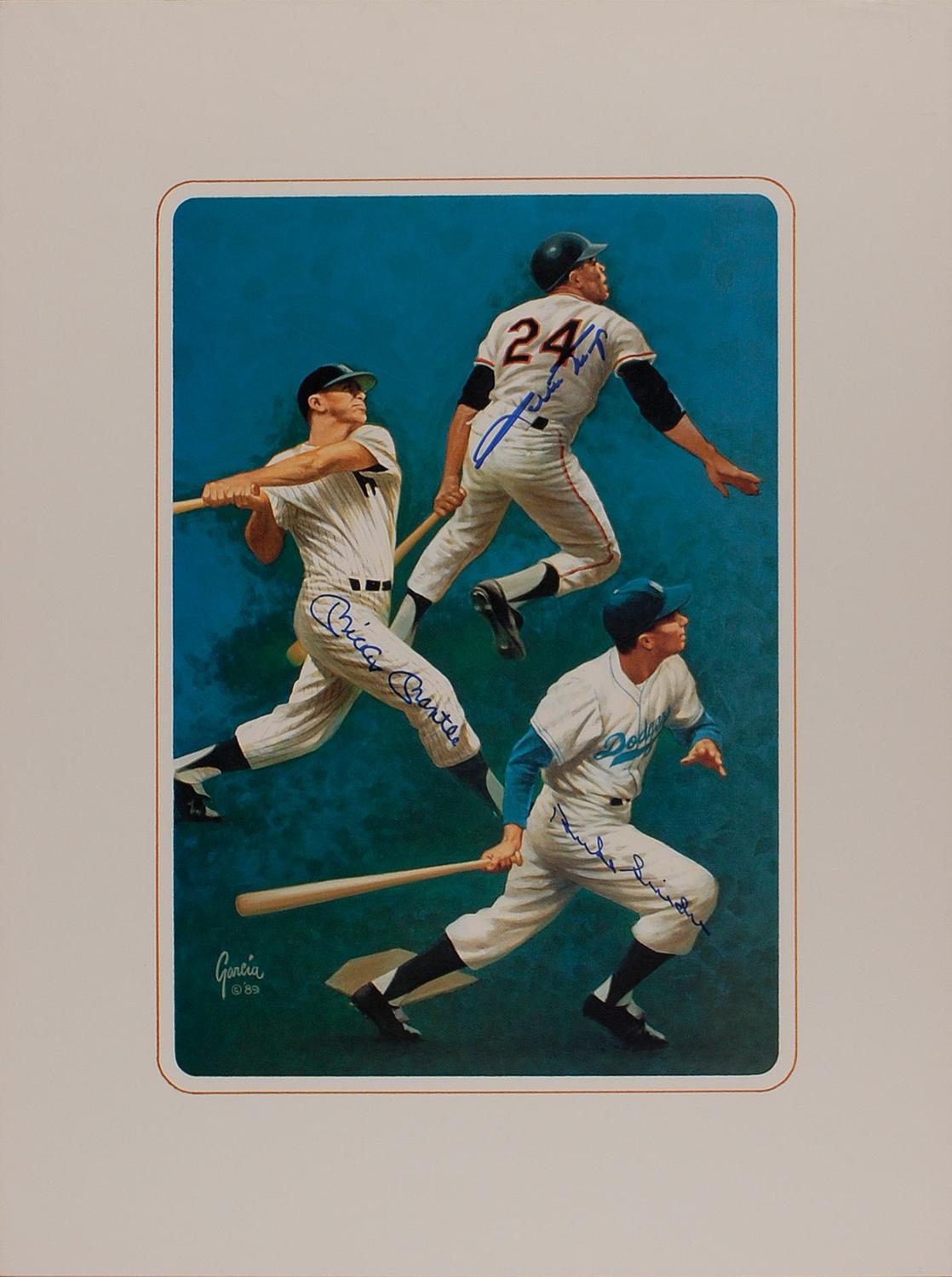 Color 18 x 24 composite lithograph of Mickey Mantle, Willie Mays, and Duke Snider in action, signed in blue felt tip by all three. Rolled and in fine condition. Accompanied by a letter of authenticity from James Spence.