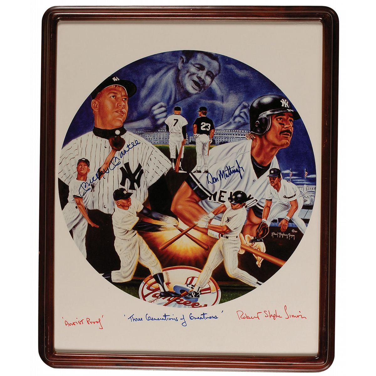 Color glossy artist’s proof of Robert Stephen Simon’s lithograph of Mantle and Mattingly, 15.25 x 19.5, signed in blue felt tip by Mickey Mantle and Don Mattingly, and also signed in the bottom border, “’Artist Proof’ Robert Stephen Simon.” Framed to an overall size of 17 x 21. In fine condition, with some light rippling.