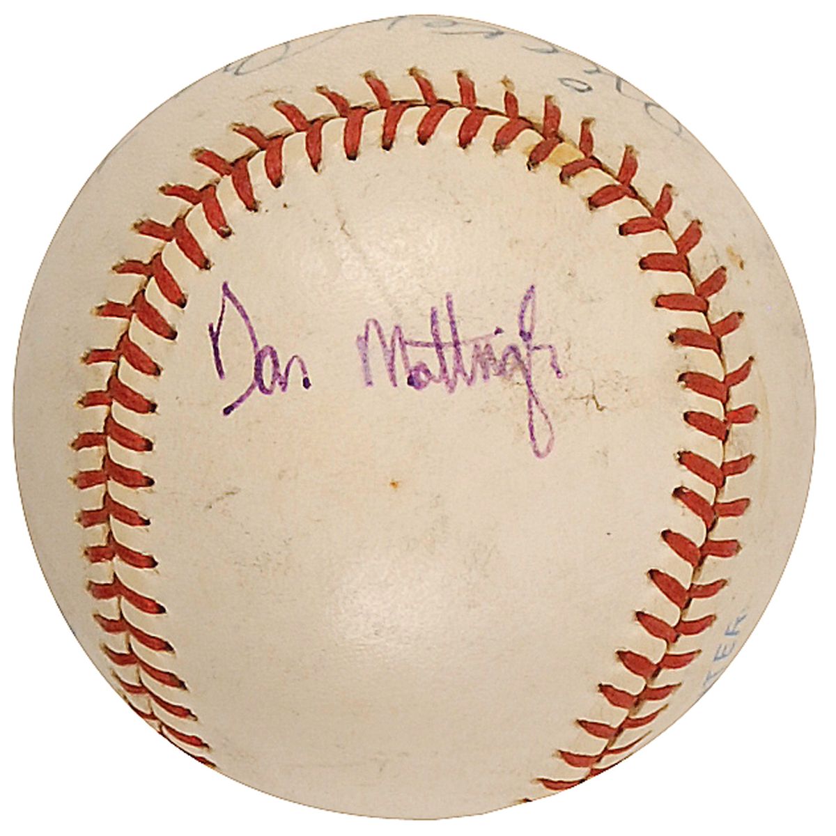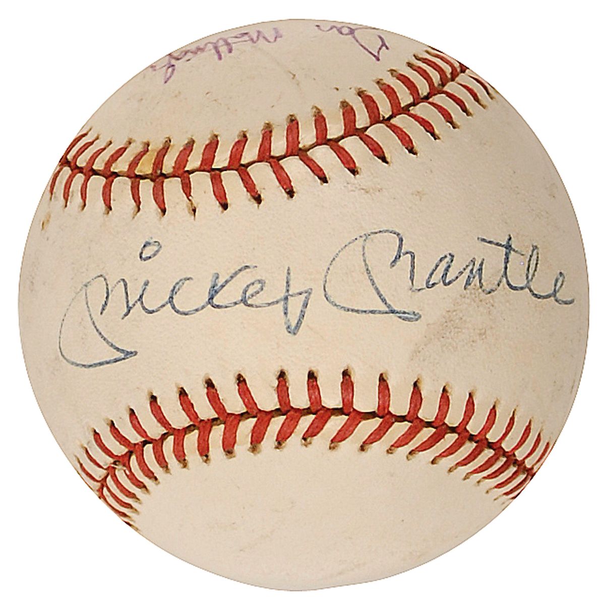Official Rawlings American League baseball signed in blue ballpoint on the sweet spot by Mickey Mantle and in purple ink on a side panel by Don Mattingly. In very good condition, with scattered soiling and a few spots of mild toning.