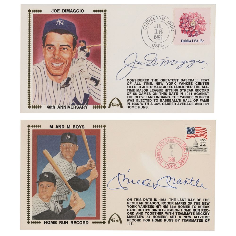 Two Gateway covers with silk color cachets honoring the New York Yankees legends, individually signed in blue ballpoint, "Mickey Mantle" and "Joe DiMaggio." In overall fine condition, with mild toning to the Mantle cover.