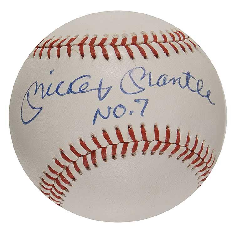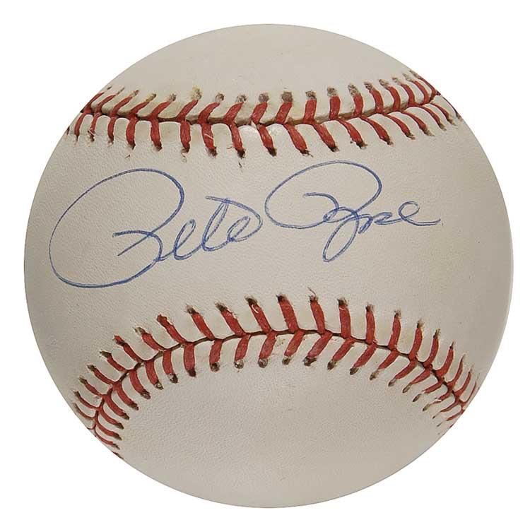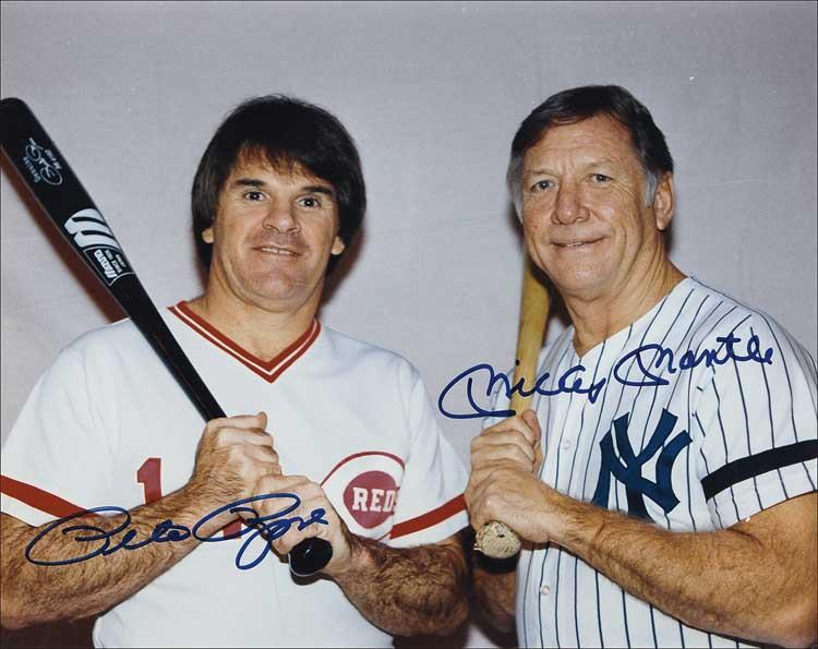 Three items, including a 10 x 8 color glossy photo, signed in blue felt tip by both, along with an official Rawlings National League baseball signed on the sweet spot by Rose, and a official Rawlings American League baseball signed on the sweet spot by Mantle, who has also added “No. 7.” In fine overall condition. Pre-certified Steve Grad/PSA/DNA and RRAuction COA.