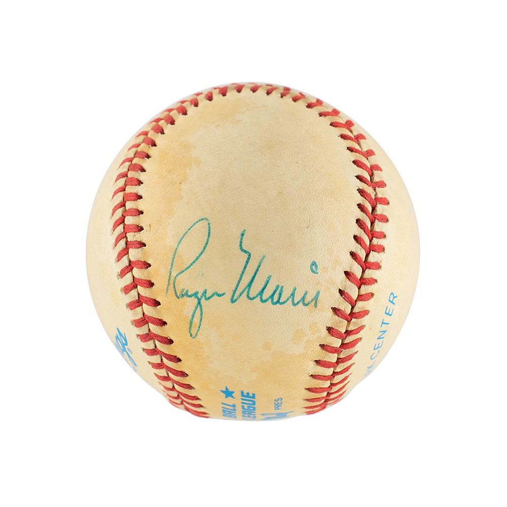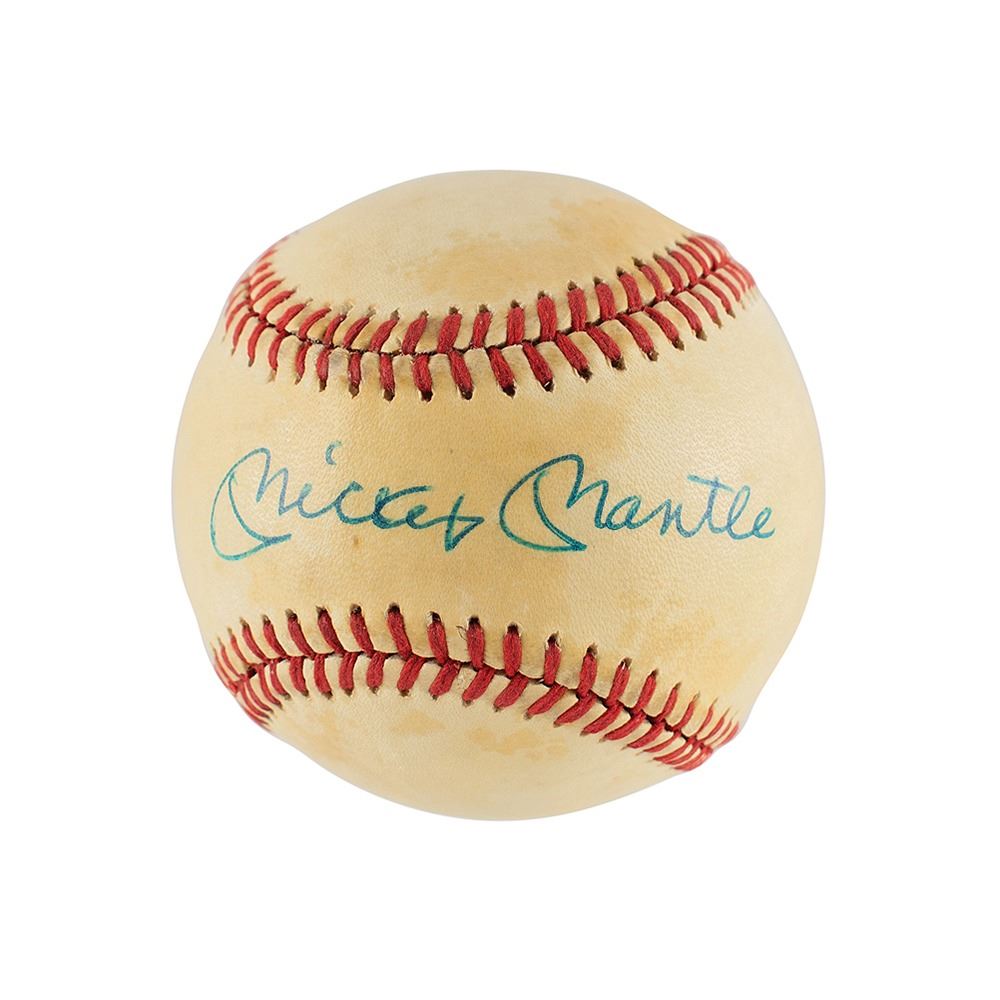 Official Rawlings American League (MacPhail) baseball signed in blue ballpoint on the sweet spot by Mickey Mantle and on a side panel by Roger Maris. In very good condition, with scattered toning to ball.