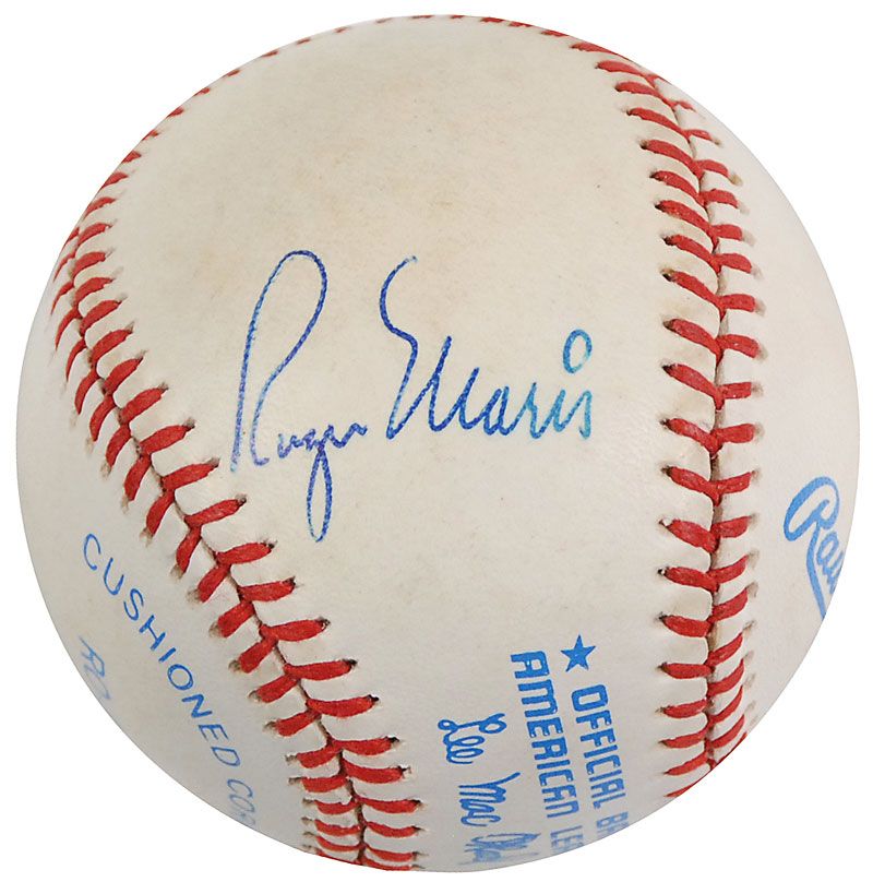 Official Rawlings American League baseball signed in blue ballpoint on the sweet spot by Mickey Mantle and on a side panel by Roger Maris. In fine condition, with some mild soiling. Accompanied by a full letter of authenticity from PSA/DNA as well as a letter of provenance from renowned collector of baseball memorabilia Barry Halper. An exceptionally desirable baseball with especially strong signatures.