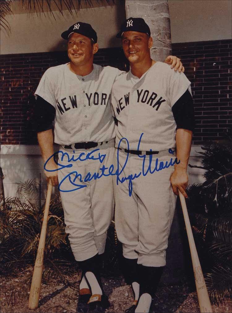Great color glossy 8 x 10 photo of Mickey Mantle and Roger Maris posing outdoors in their road uniforms in front of a palm tree, signed in blue felt tip by both Mantle and Maris. Triple matted and framed to an overall size of 12 x 15. In very fine condition. Pre-certified Steve Grad/PSA/DNA and RRAuction COA.