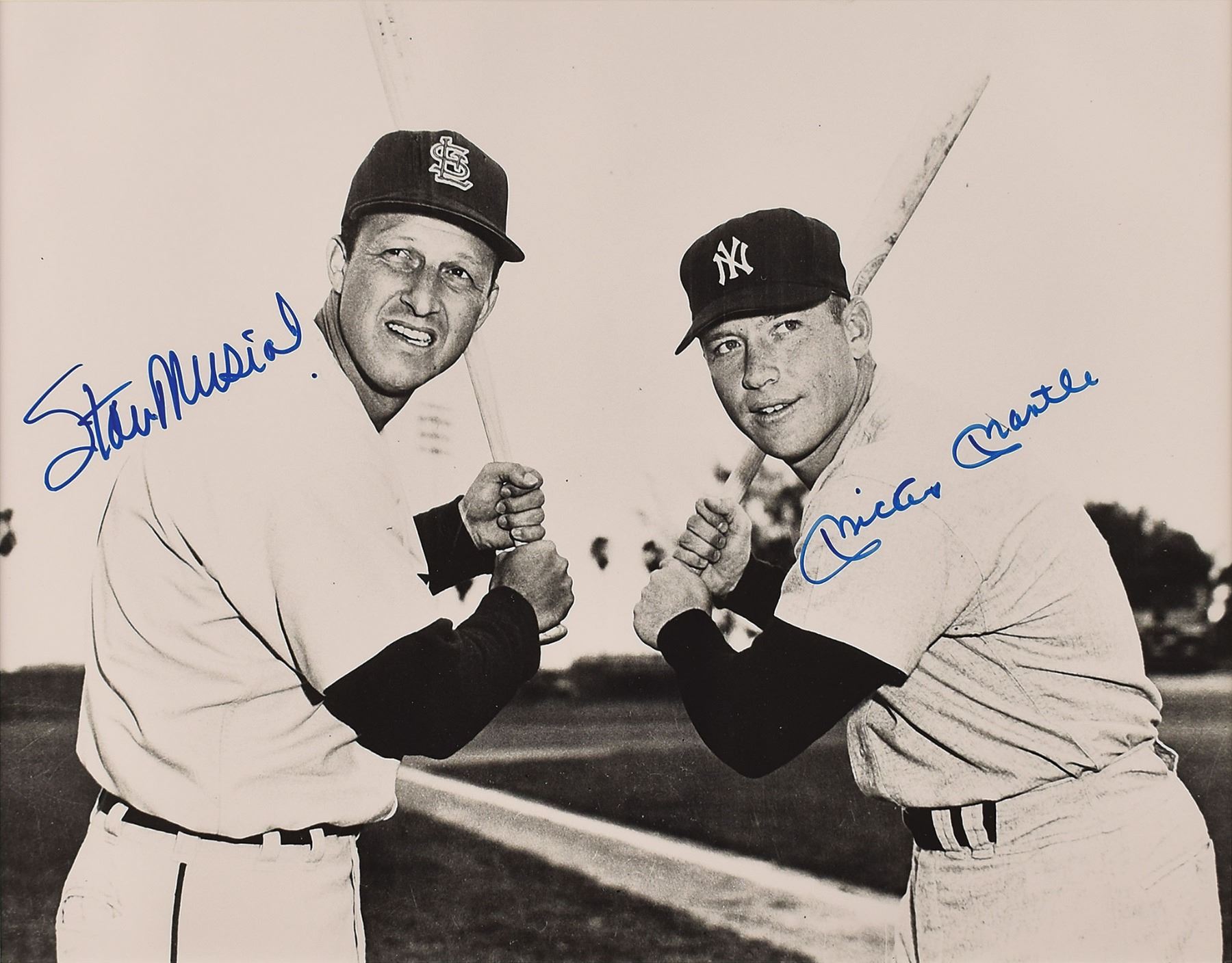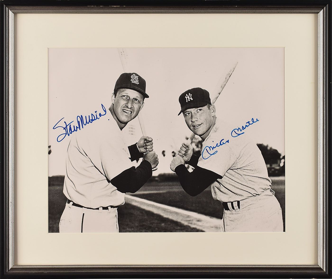 Glossy 13.5 x 10.5 photo of the legendary sluggers posing in their batting stances, nicely signed in blue felt tip by Mickey Mantle and Stan Musial. Matted and framed to an overall size of 19 x 16. In fine condition, with slight rippling.