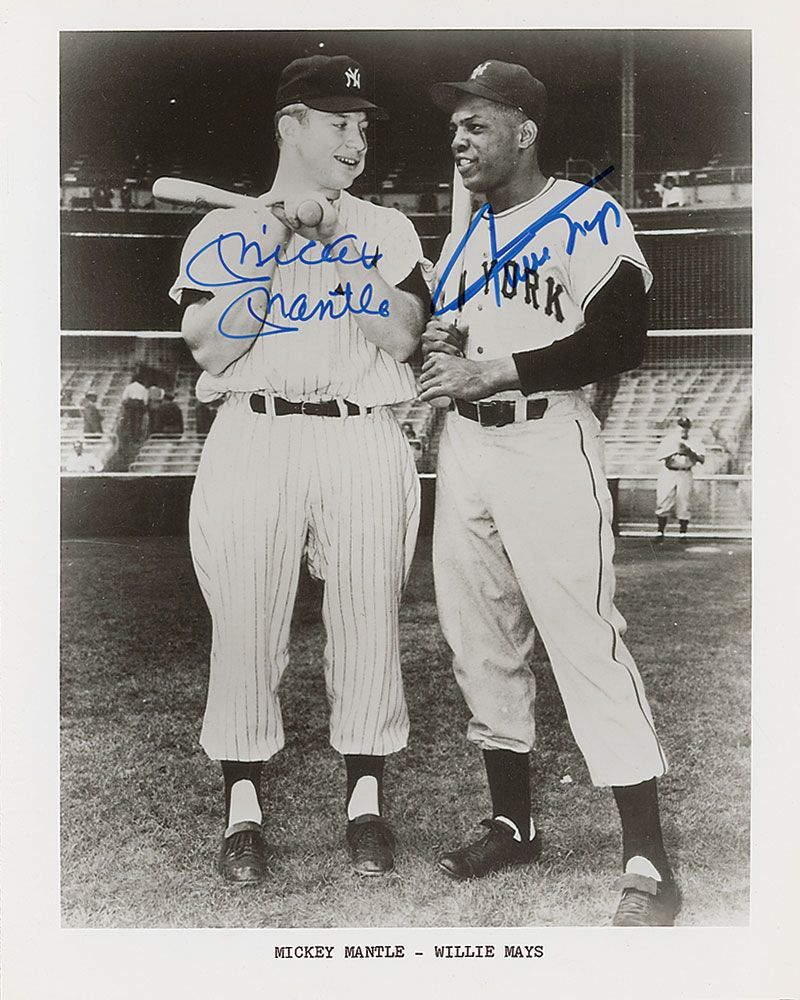 Glossy 8 x 10 photo of the two legendary New York center fielders, signed in blue felt tip by both Mantle and Mays. In fine condition, with a crease to the left of Mantle’s leg.
