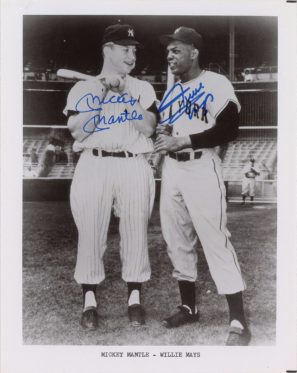 Glossy 8 x 10 photo of Mickey Mantle and Willie Mays conversing in their respective uniforms, signed in blue felt tip by both. In fine condition.
