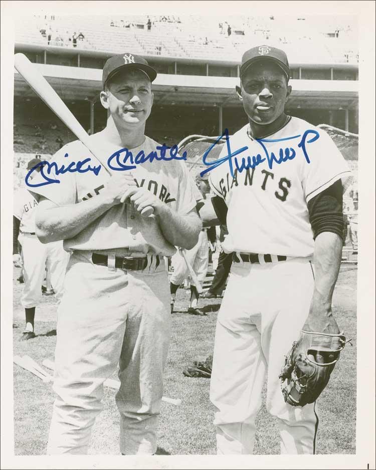 Glossy 8 x 10 photo of Mickey Mantle and Willie Mays posing together before a game, signed in blue felt tip by both Mays and Mantle. In fine condition, with some scattered light surface creases. Pre-certified Steve Grad/PSA/DNA and RRAuction COA.