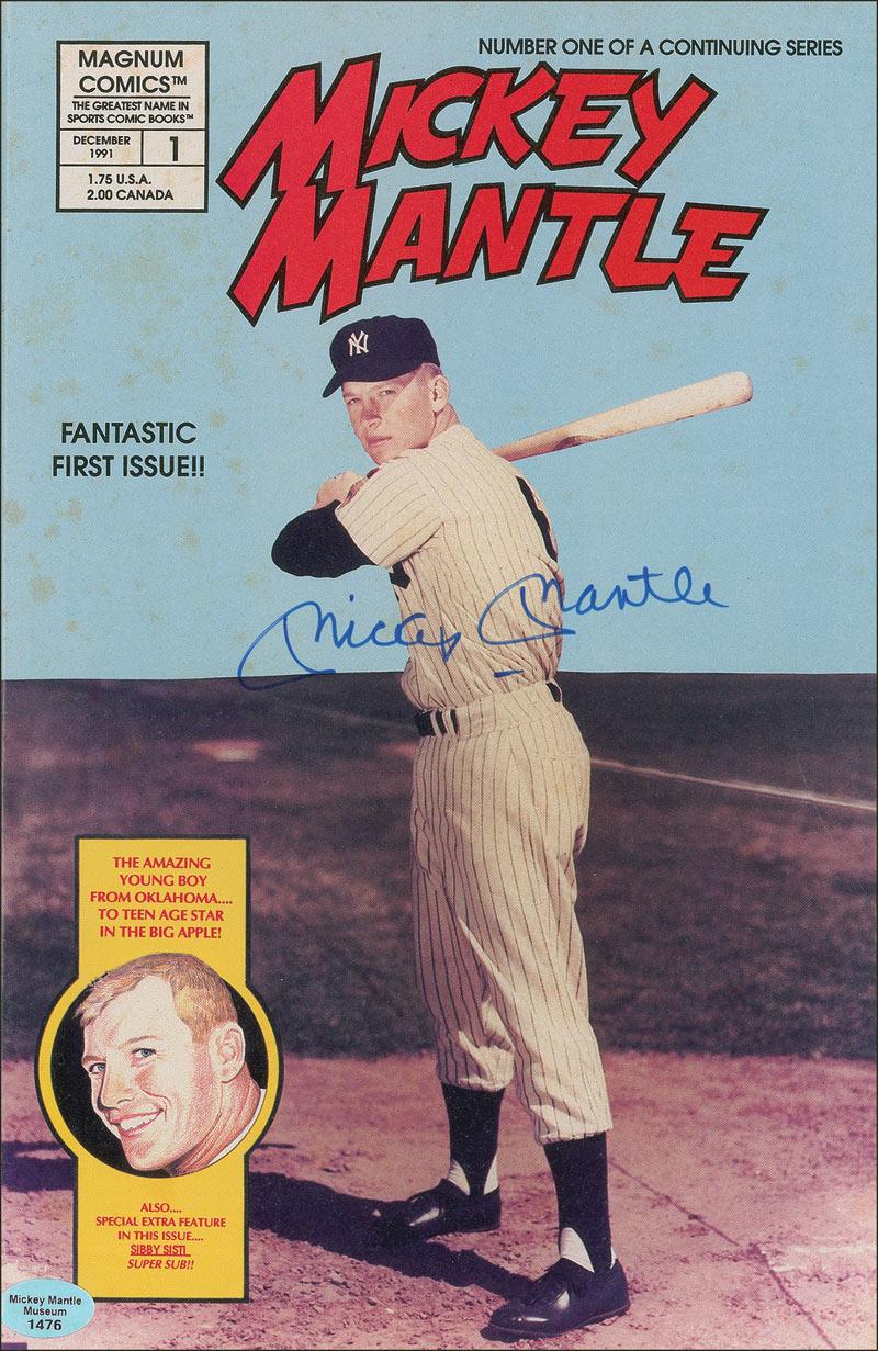 Mickey Mantle comic book, #1, issued by Magnum Comics, dated December 1991, 6.5 x 10, signed on the front cover in blue felt tip by Mantle. Scattered foxing to cover, otherwise fine condition.