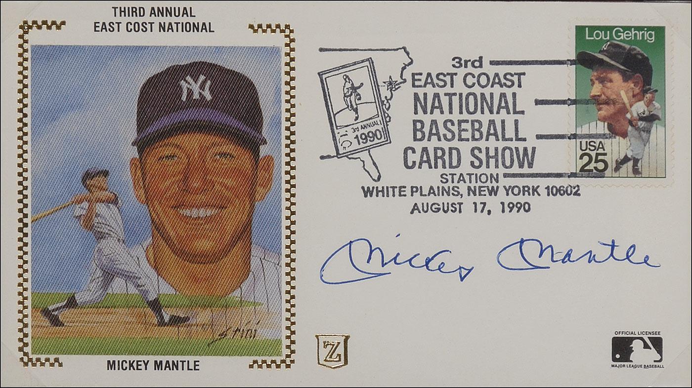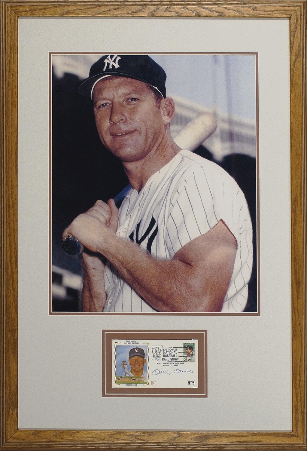 Commemorative cover with a cachet honoring Mantle and the Third Annual East Coast National Baseball Card Show, signed in blue ink by Mantle. Double matted and framed with a large color glossy portrait of Mantle at Yankee Stadium to an overall size of 24 x 34. In very fine condition. Oversized.
