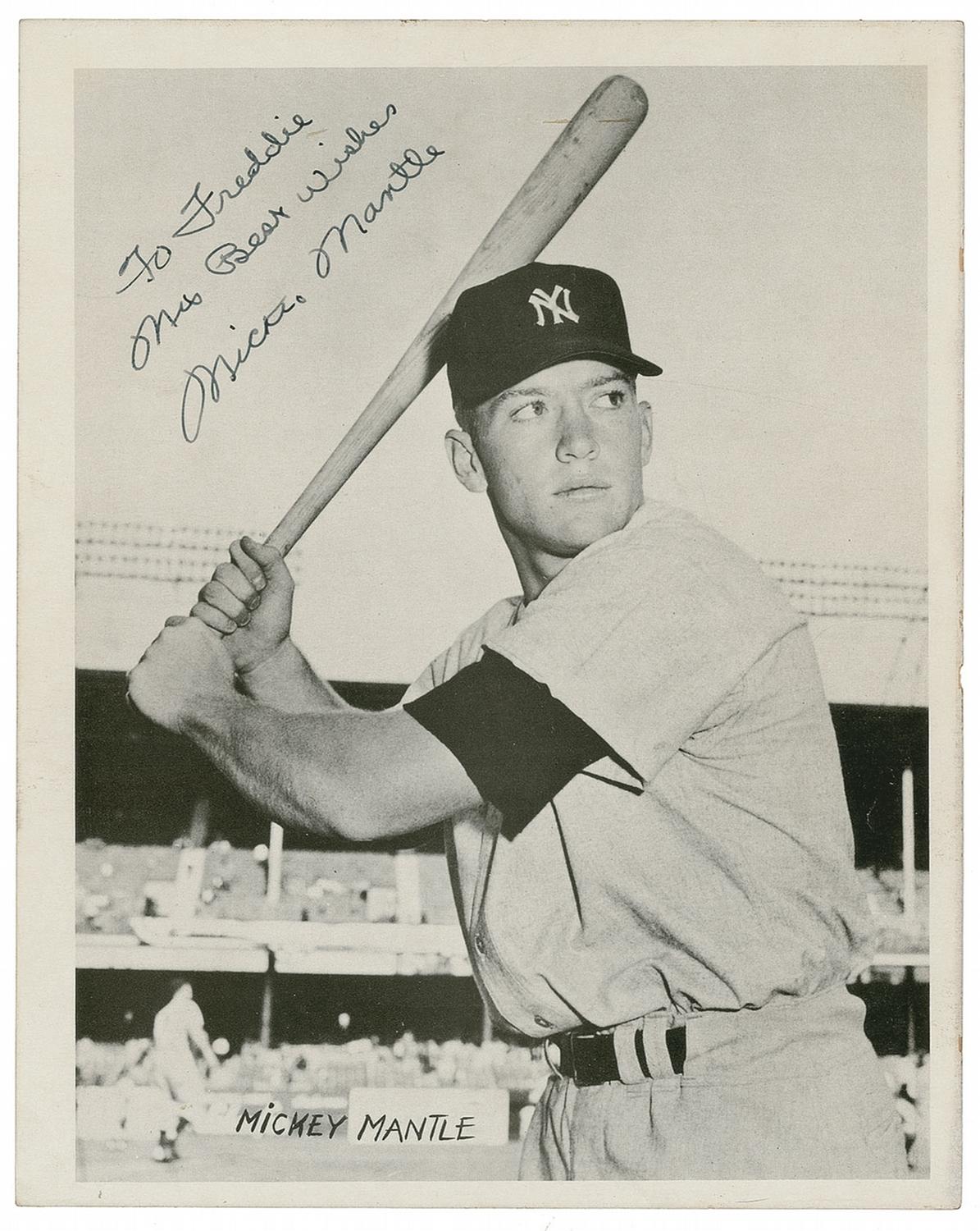 Glossy 8 x 10 paperstock photo, signed and inscribed in black ink, “To Freddie. My Best Wishes, Mickey Mantle.” In fine condition, with light creases and edge wear. This rare early signature dates to circa 1956—the year that Mantle won his Triple Crown.