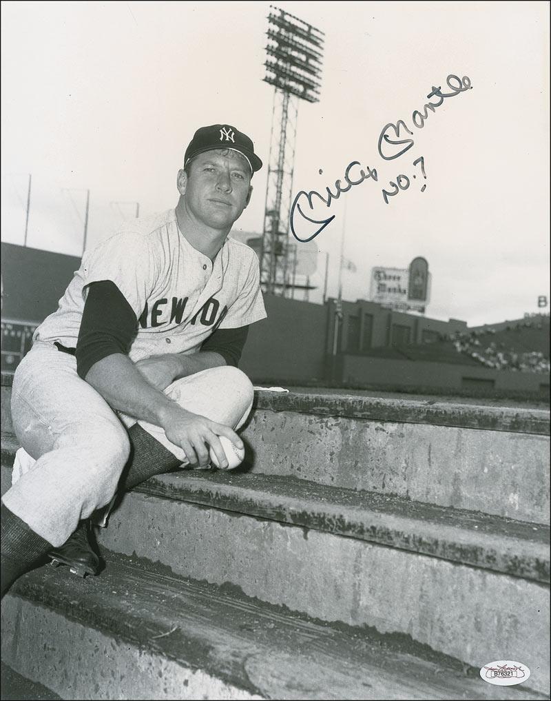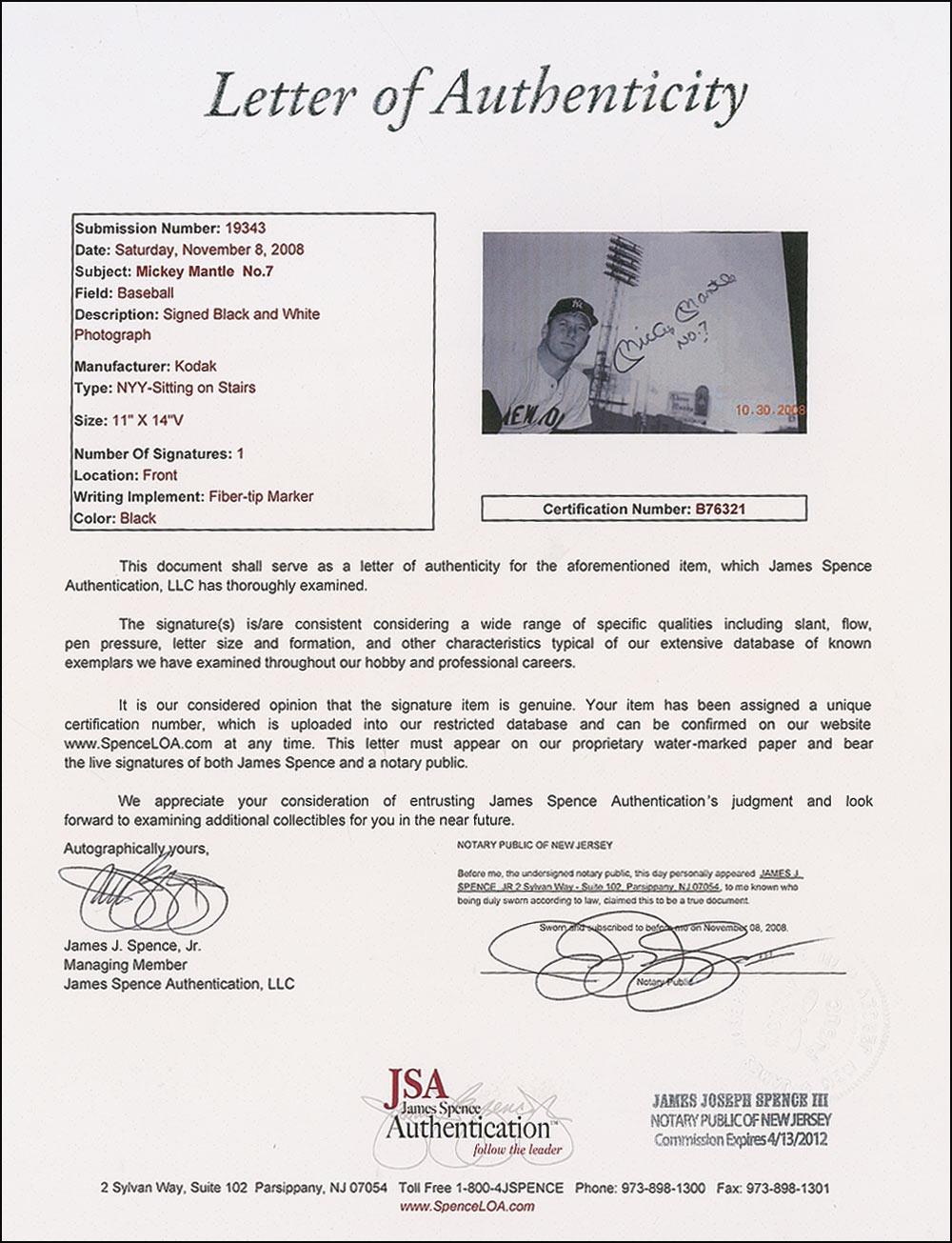 Glossy 11 x 14 photo of Mantle in his New York Yankees road uniform, signed in black felt tip “Mickey Mantle No. 7.” In fine condition, with a “witnessed authentic” blind stamp beneath his signature and a James Spence Authentication label affixed at the bottom right corner. Accompanied by a full Letter of Authenticity from James Spence.