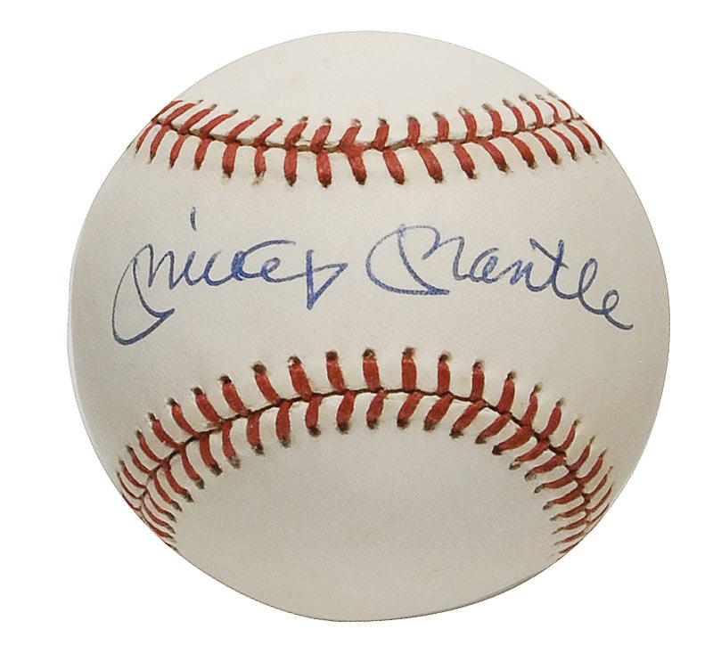 Official Rawlings American League baseball signed in blue ballpoint on the sweet spot, “Mickey Mantle.” In fine condition, with scattered spots of toning.
