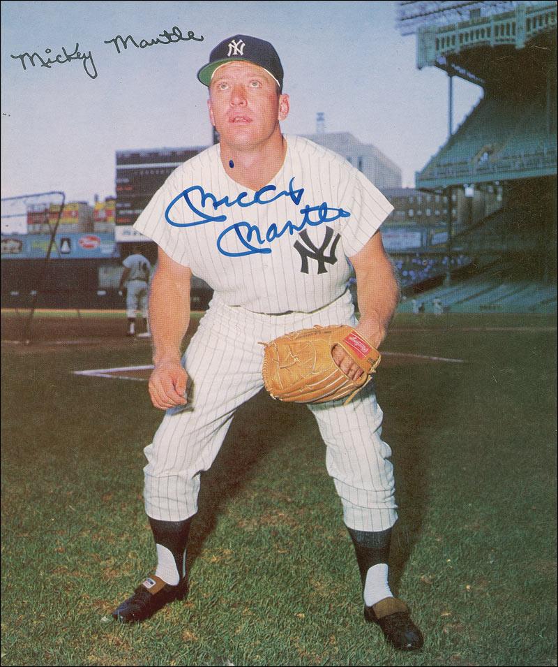 Color 8 x 9.5 cardstock Rawlings promotional photo, signed in blue felt tip “Mickey Mantle” near a pre-printed signature. In fine condition, with some scattered surface impressions.