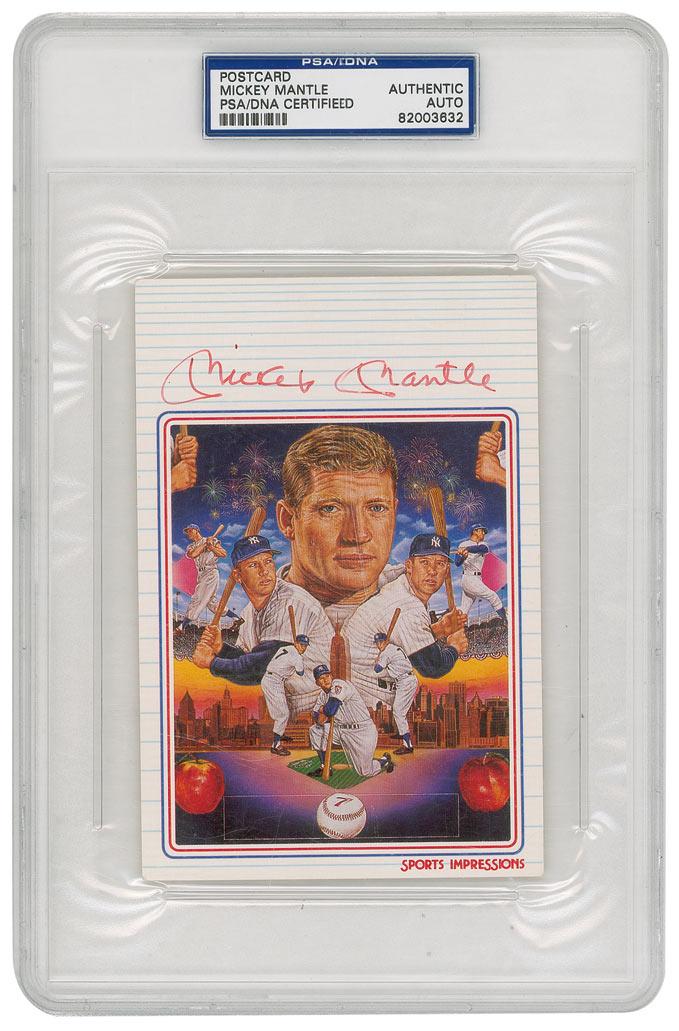 Color 4 x 6 Sports Impressions postcard photo, signed in red felt tip at the top border. Encapsulated in a plastic PSA/DNA authentication holder. In fine condition.