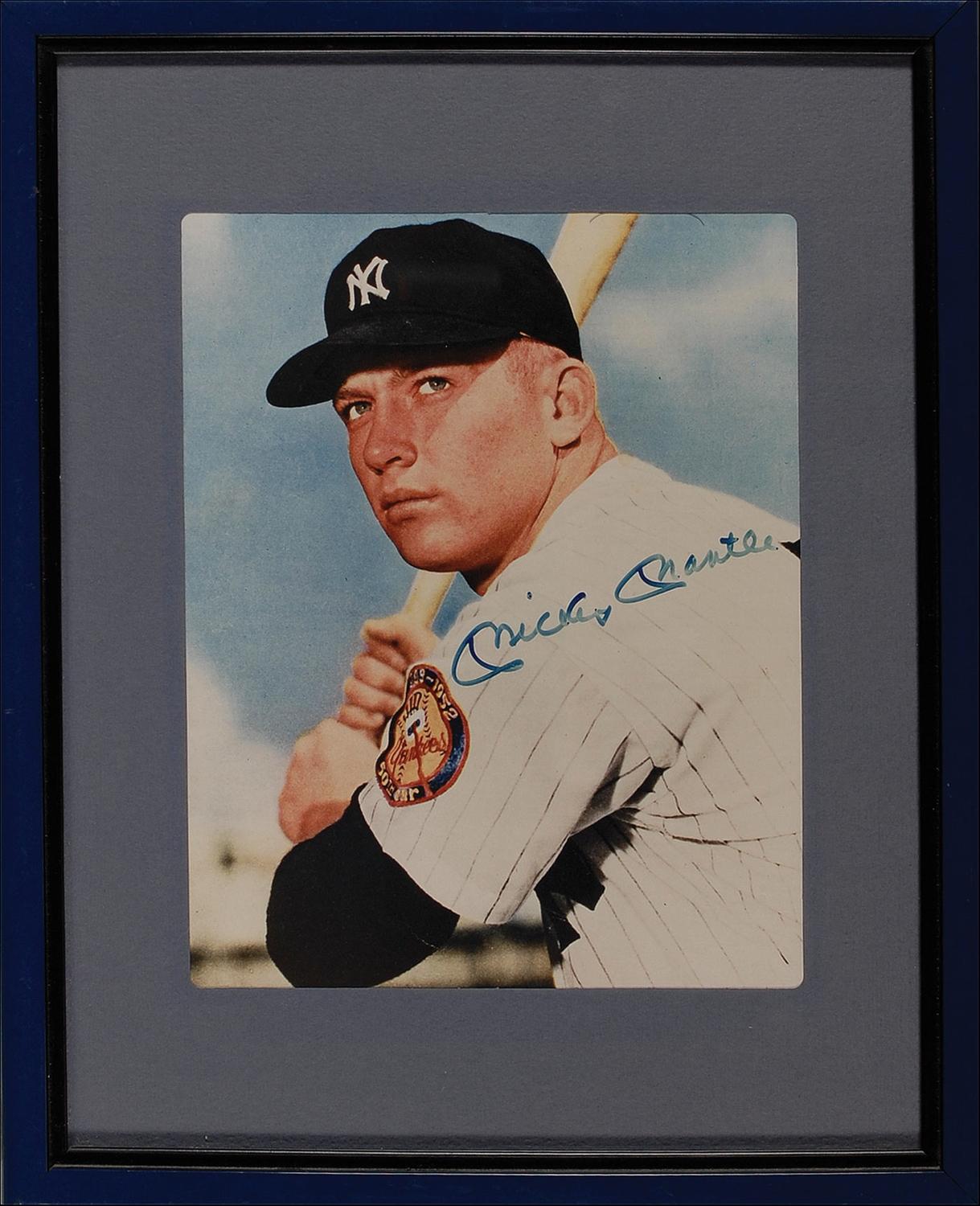 Color 7.25 x 9.5 magazine photo of Mantle in his Yankee pinstripes from his 1952 season, signed in blue felt tip. Matted and framed to an overall size of 12 x 15. In fine condition.