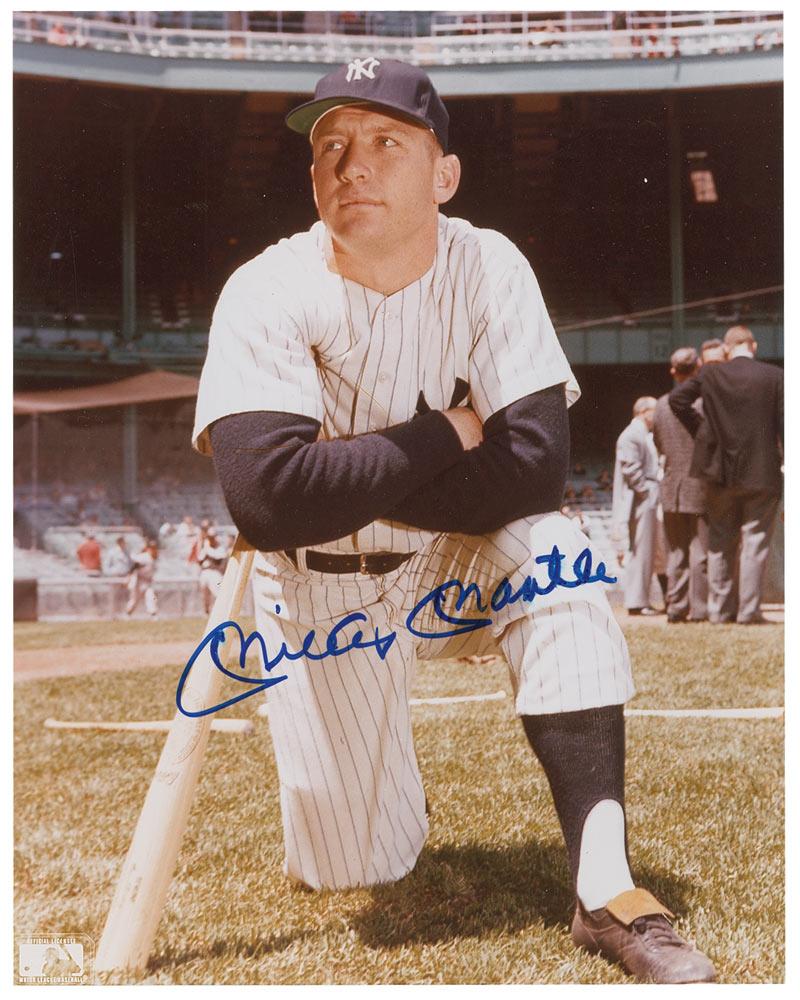 Color glossy 8 x 10 photo of a young Mantle taking a knee inside Yankee Stadium before a game, signed in blue felt tip. In fine condition, with a bit of slight irregular ink adhesion to last name of signature.