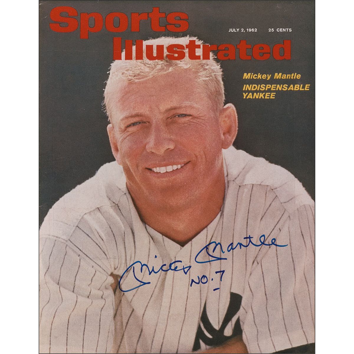 Color glossy 11 x 14 photo of the July 2, 1962, Sports Illustrated cover featuring Mantle, affixed to a foam core mount of the same size, signed in blue felt tip, “Mickey Mantle, No. 7.” In fine condition.