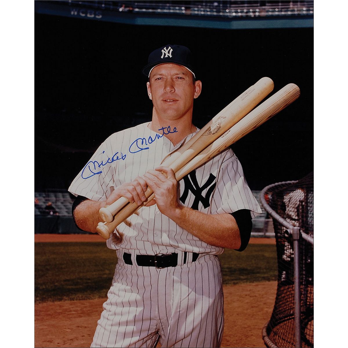 Excellent color satin-finish 16 x 20 photo of Mantle in his Yankees pinstripes posing next to the batting cage, signed in blue felt tip. In fine condition.